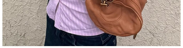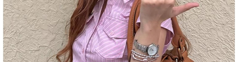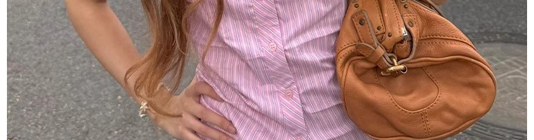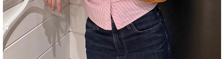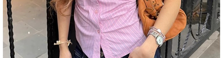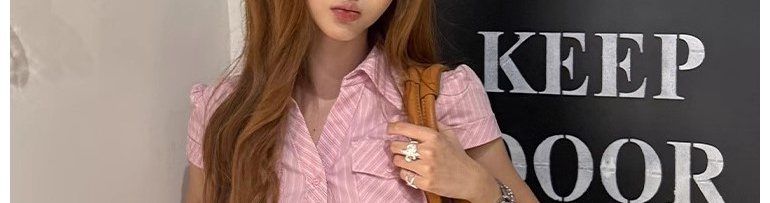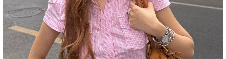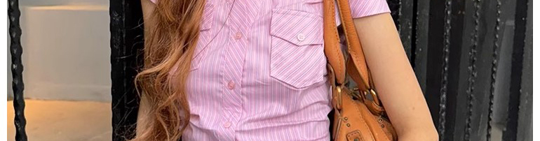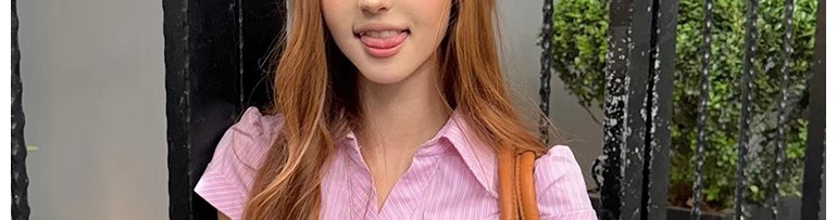 - Top: Pink striped short sleeve shirt with waist cut, slim fit, soft cotton fabric.