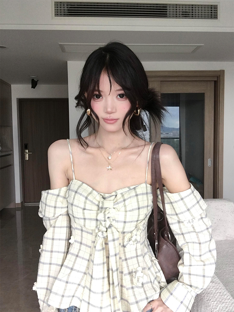 Korean-style plaid tank shirt with bow and floral details. Slim fit, cute and elegant for early autumn.
