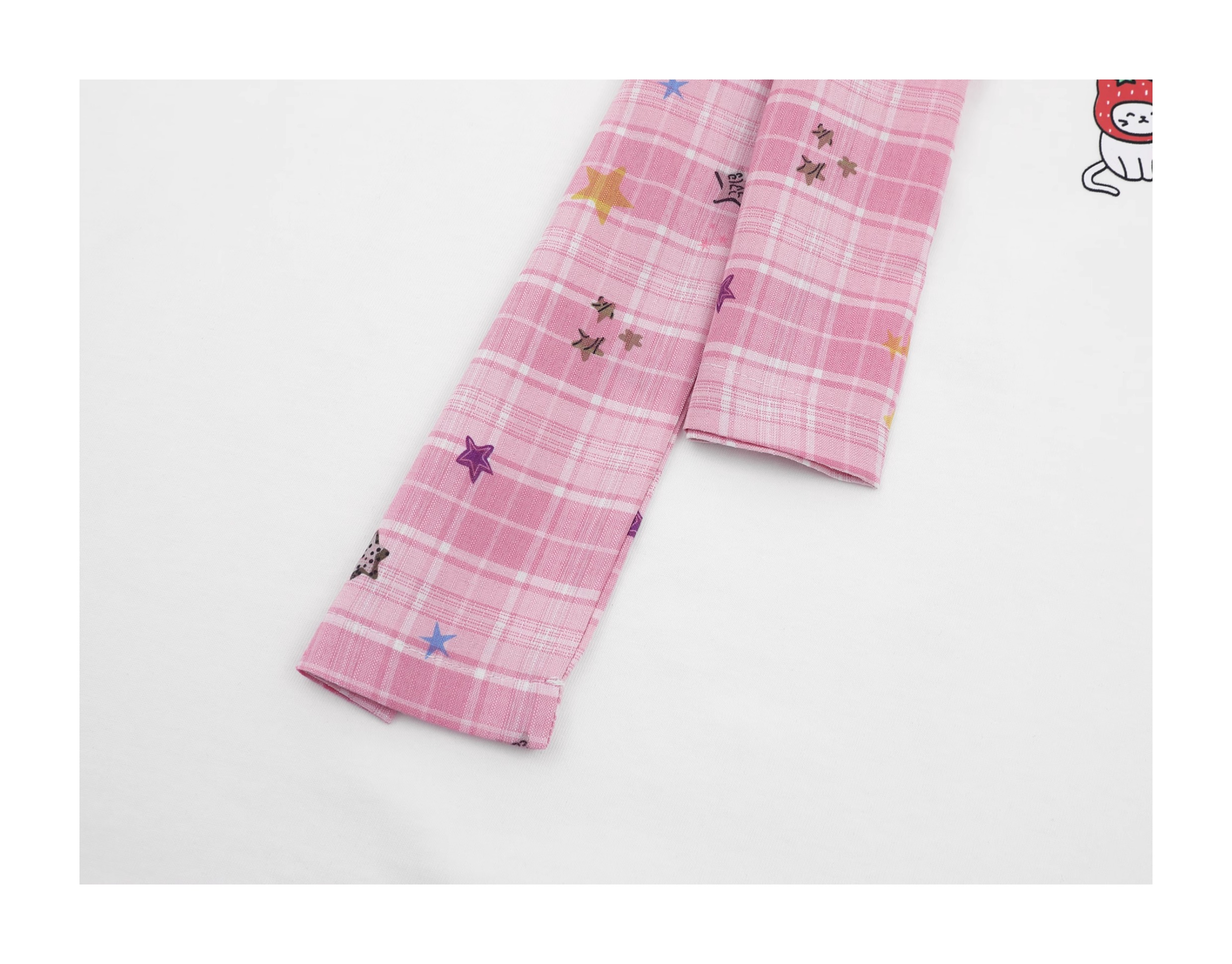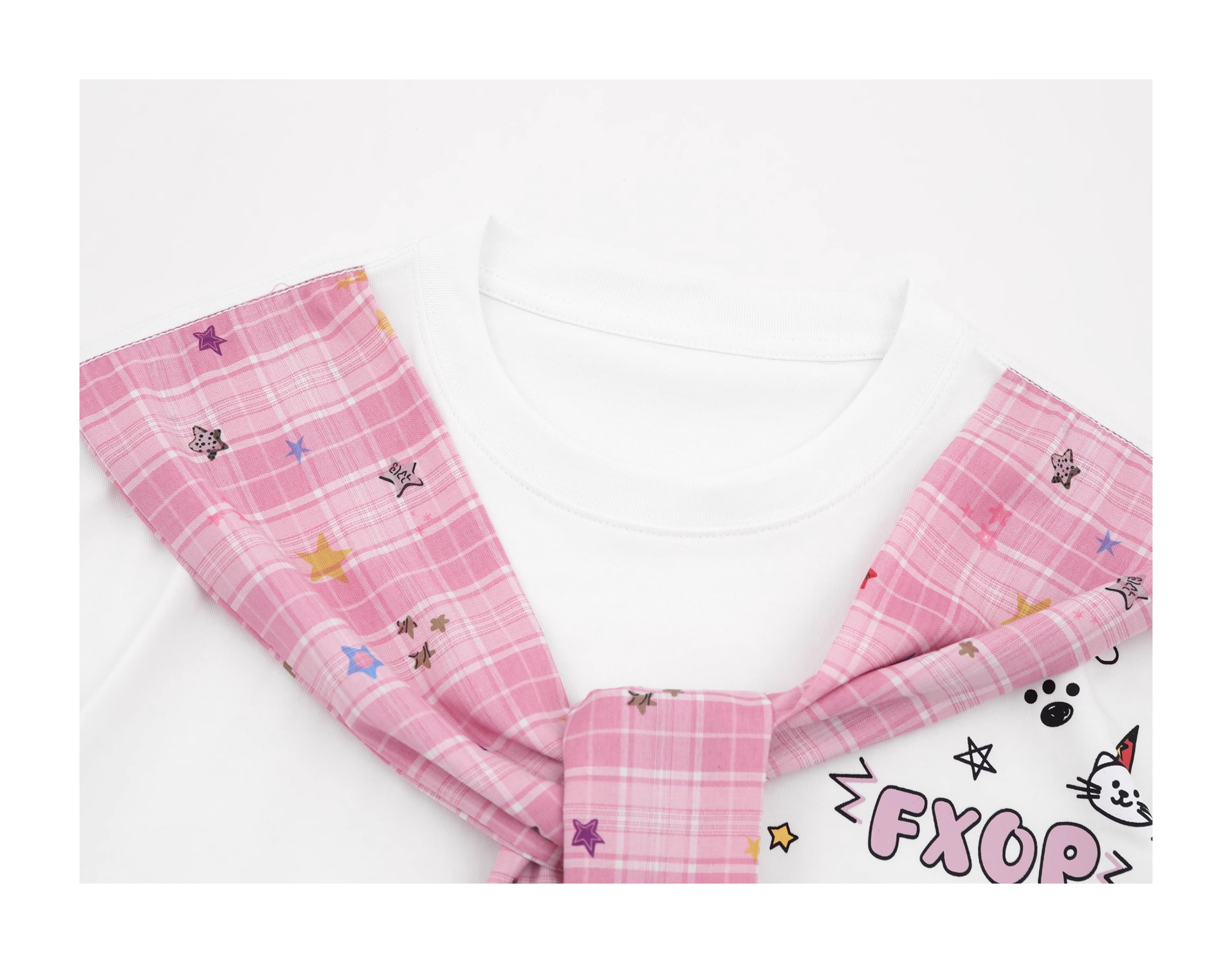- Top: Short-sleeve T-shirt with faux plaid shoulder scarf design and relaxed unisex fit.