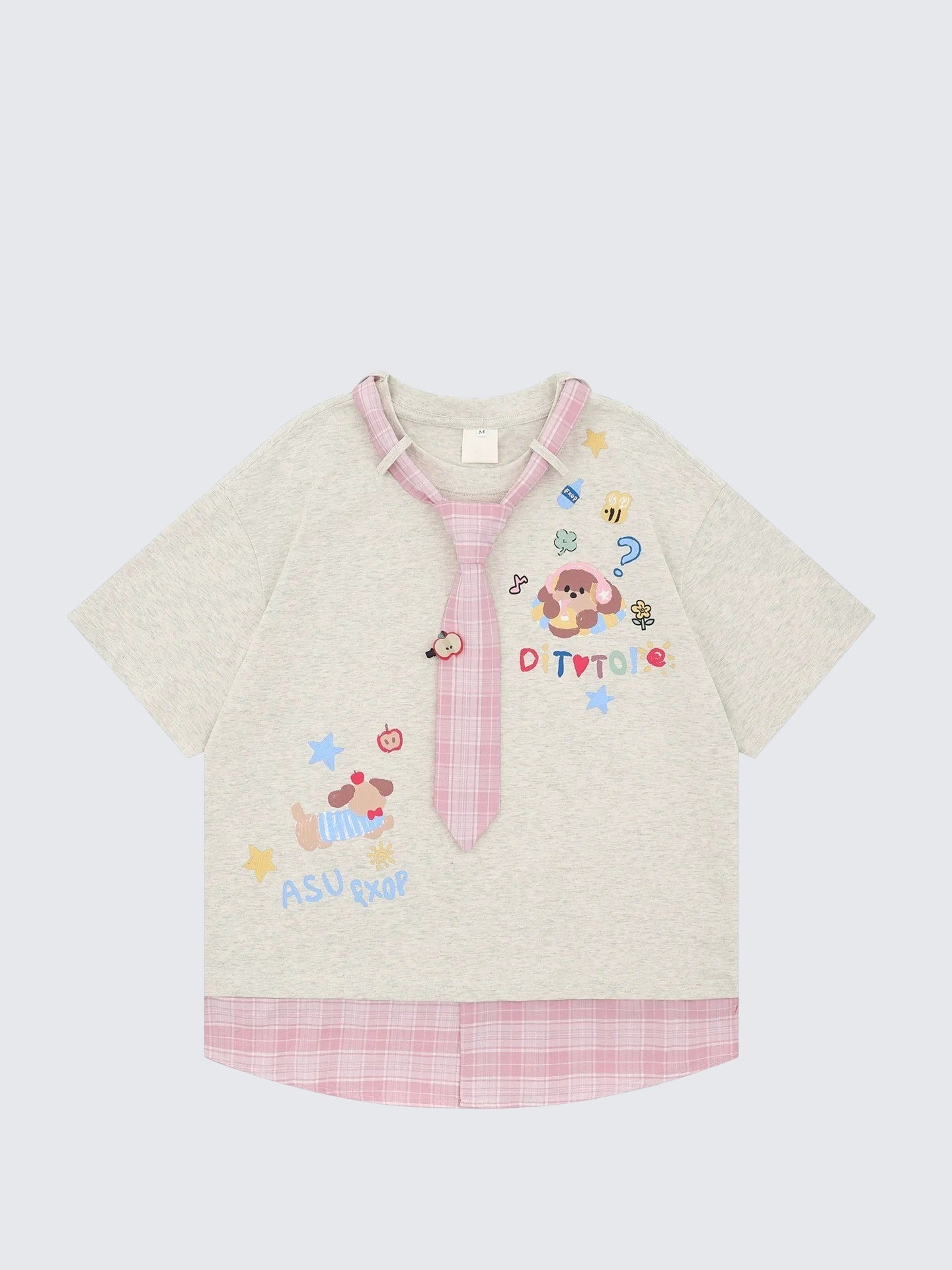 - Top: Short sleeve layered tee with plaid tie detail, lightweight summer fabric, slim-fit design.