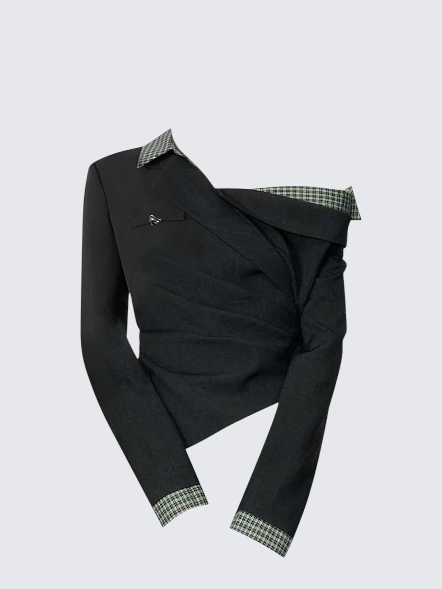 Retro plaid patchwork blazer-style tee with off-shoulder detail and slim waist design. Unique layered look for fall.