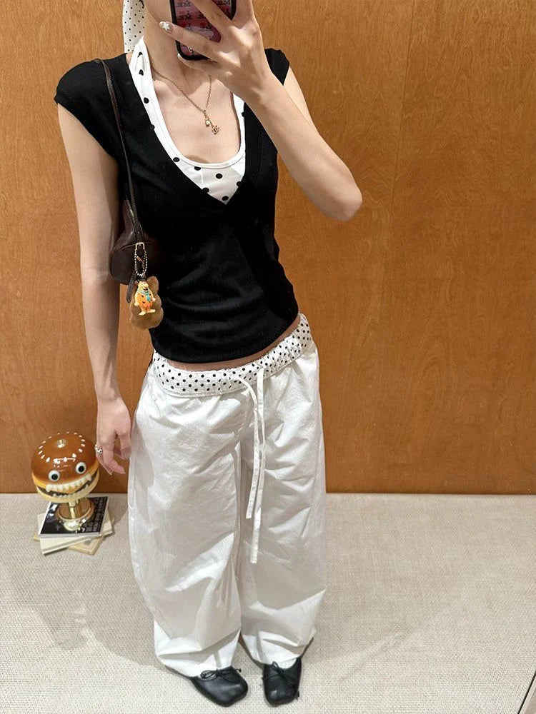 - Set: Matching set includes retro polka-dot vest and V-neck short sleeve top, featuring (color-block) details. Blends Y2K light subculture and retro playfulness.