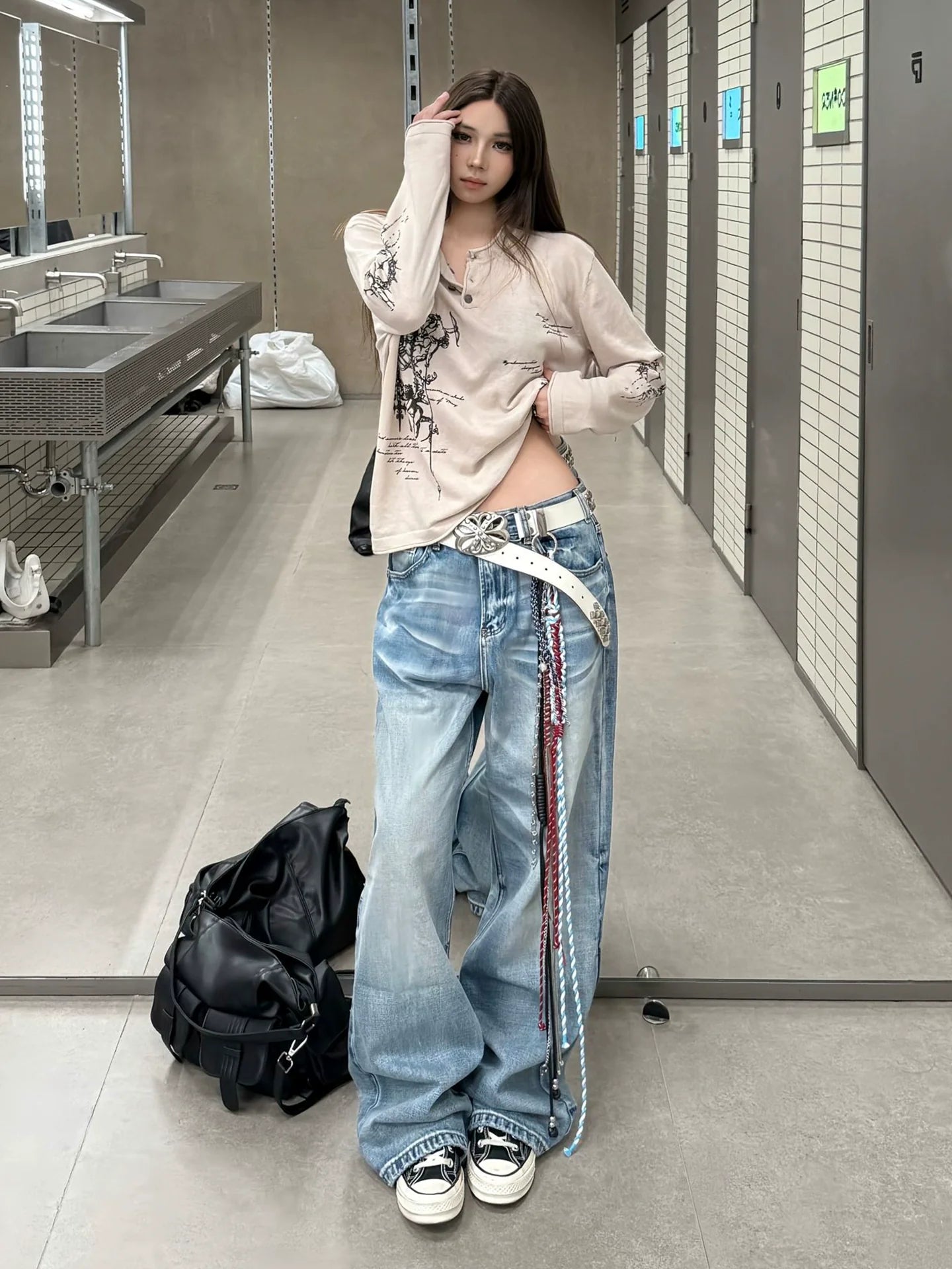 Punk Subculture Printed Long Sleeve Tee Henry Collar Loose Fit Base Top