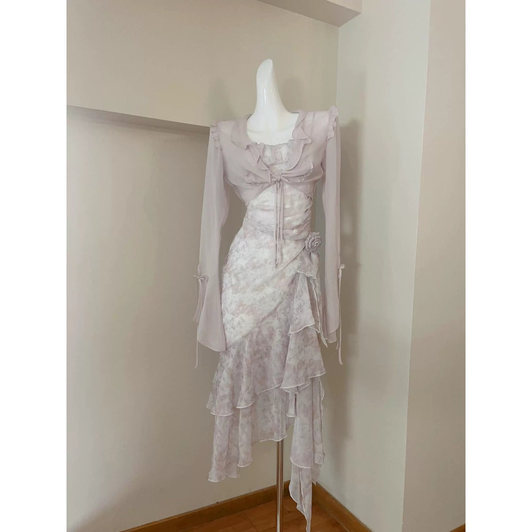 - Soft purple silk blouse with bow detail, long sleeves, and ruffled hem. Light and airy, perfect as a stylish sun-protection layering piece.
