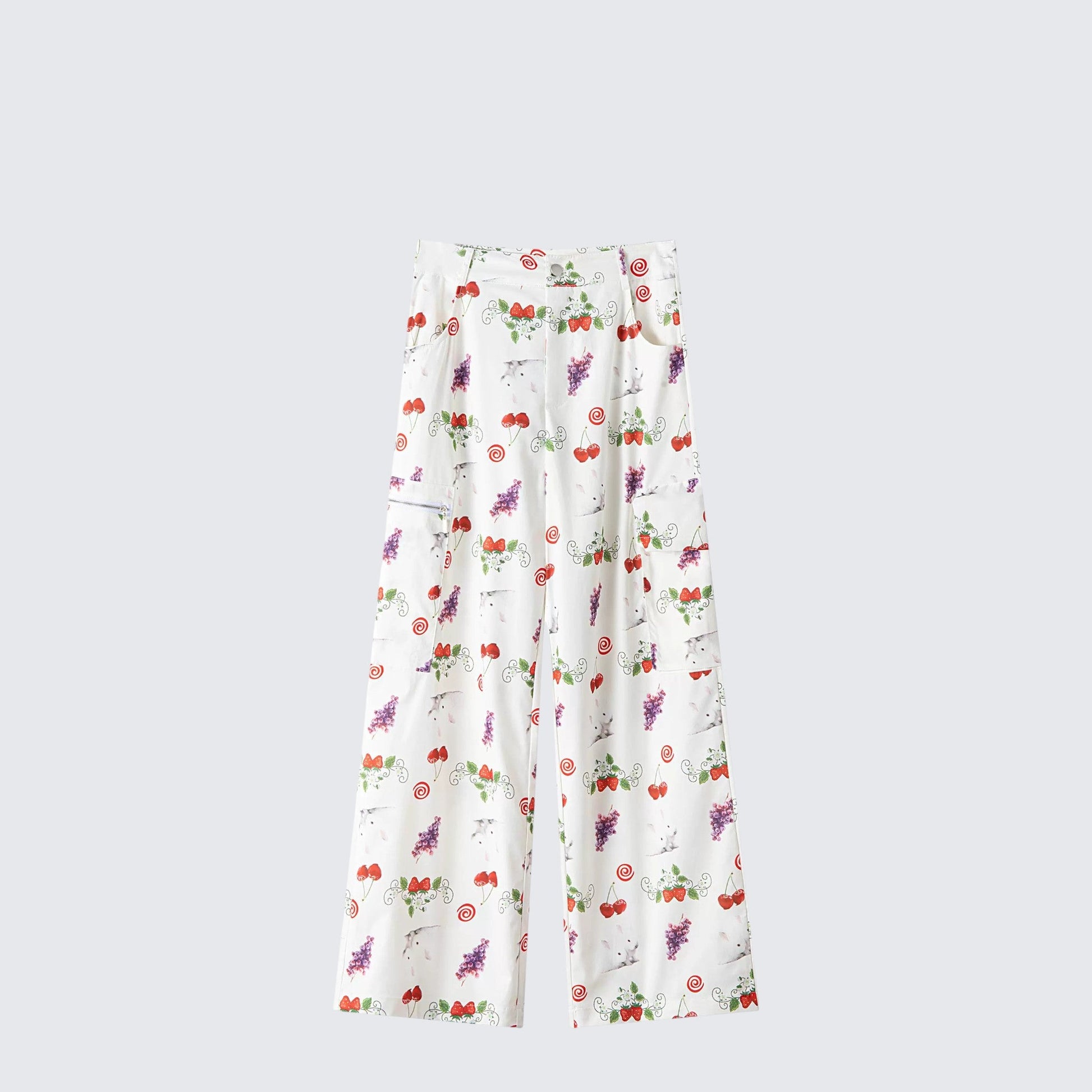 - Pants: Wide-leg cargo pants with playful fruit and rabbit prints, relaxed fit.