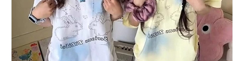 - Top: Loose-fit V-neck short sleeve tee with rabbit print and drawstring hem, soft breathable cotton fabric.