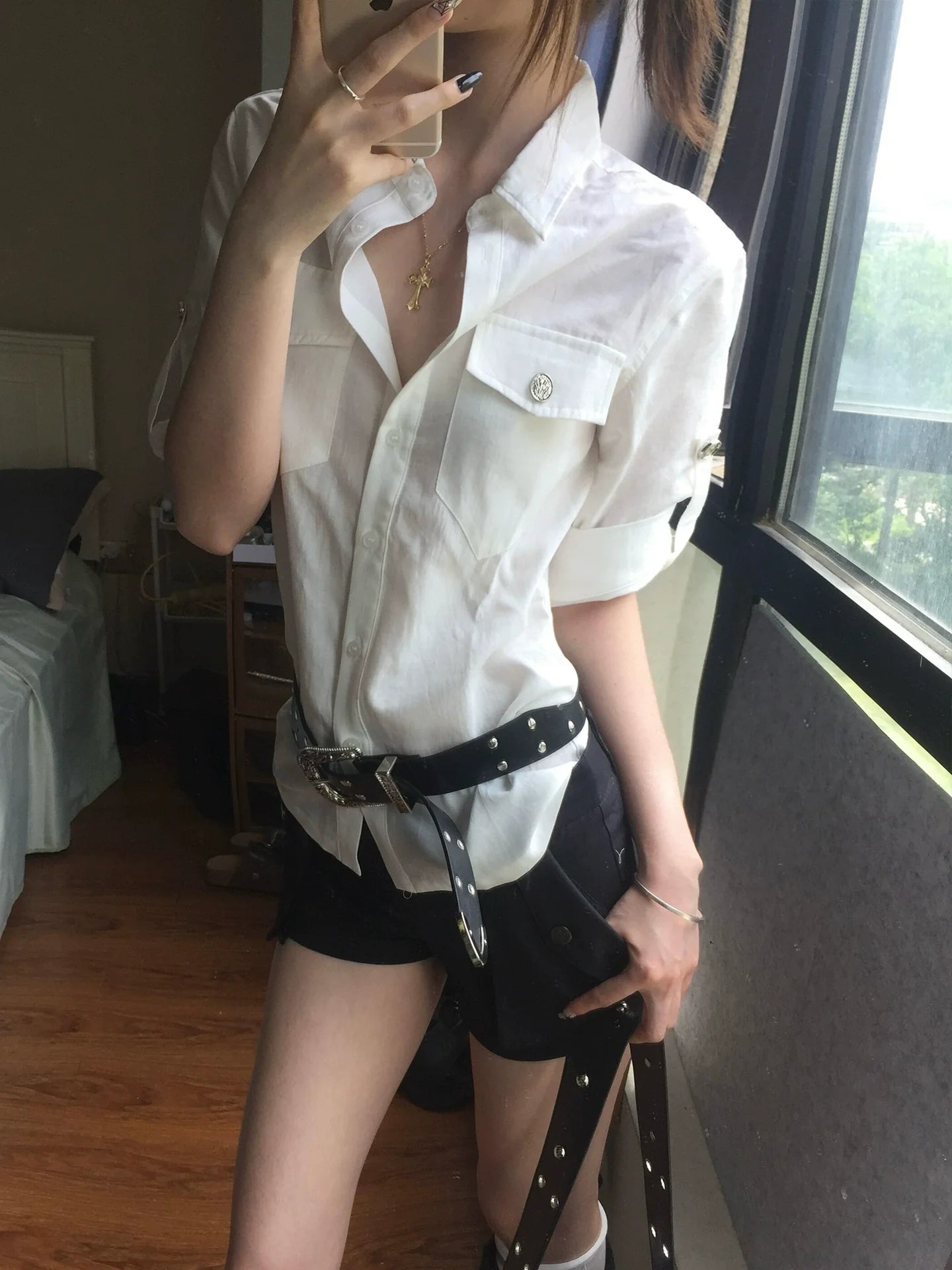 - Top: Summer white short sleeve shirt with waist-cinched design, structured pockets, relaxed girly silhouette, soft cotton fabric, Y2K aesthetic.