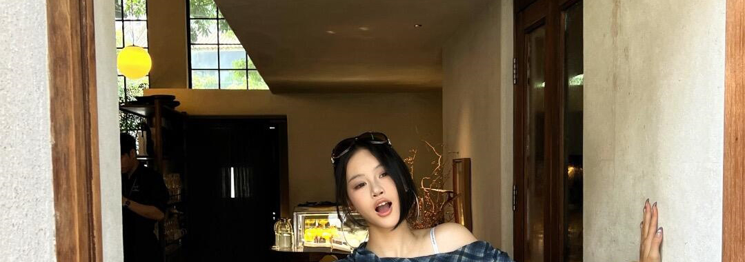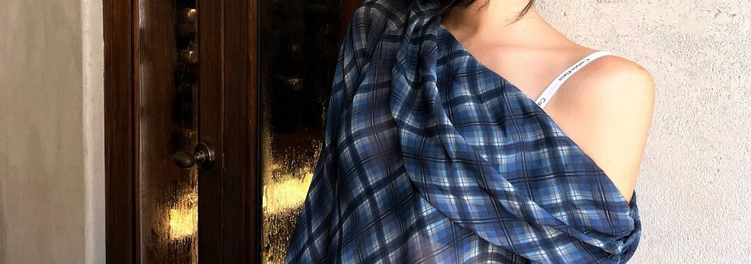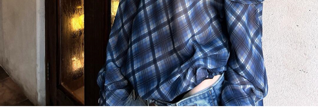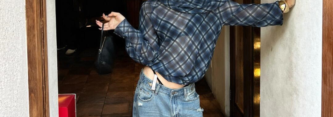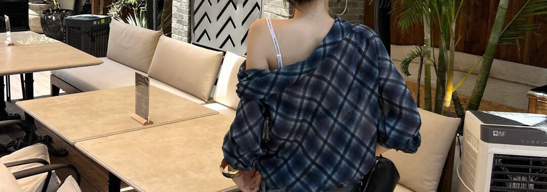 - Top: Slim-fit plaid short sleeve shirt with off-shoulder design and semi-sheer fabric for a retro chic vibe.