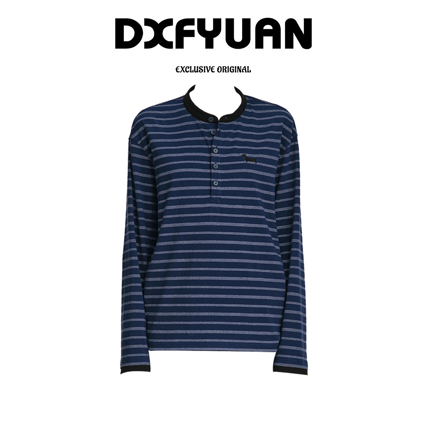 - Top: Color-block striped long sleeve T-shirt with Henley collar and relaxed fit.