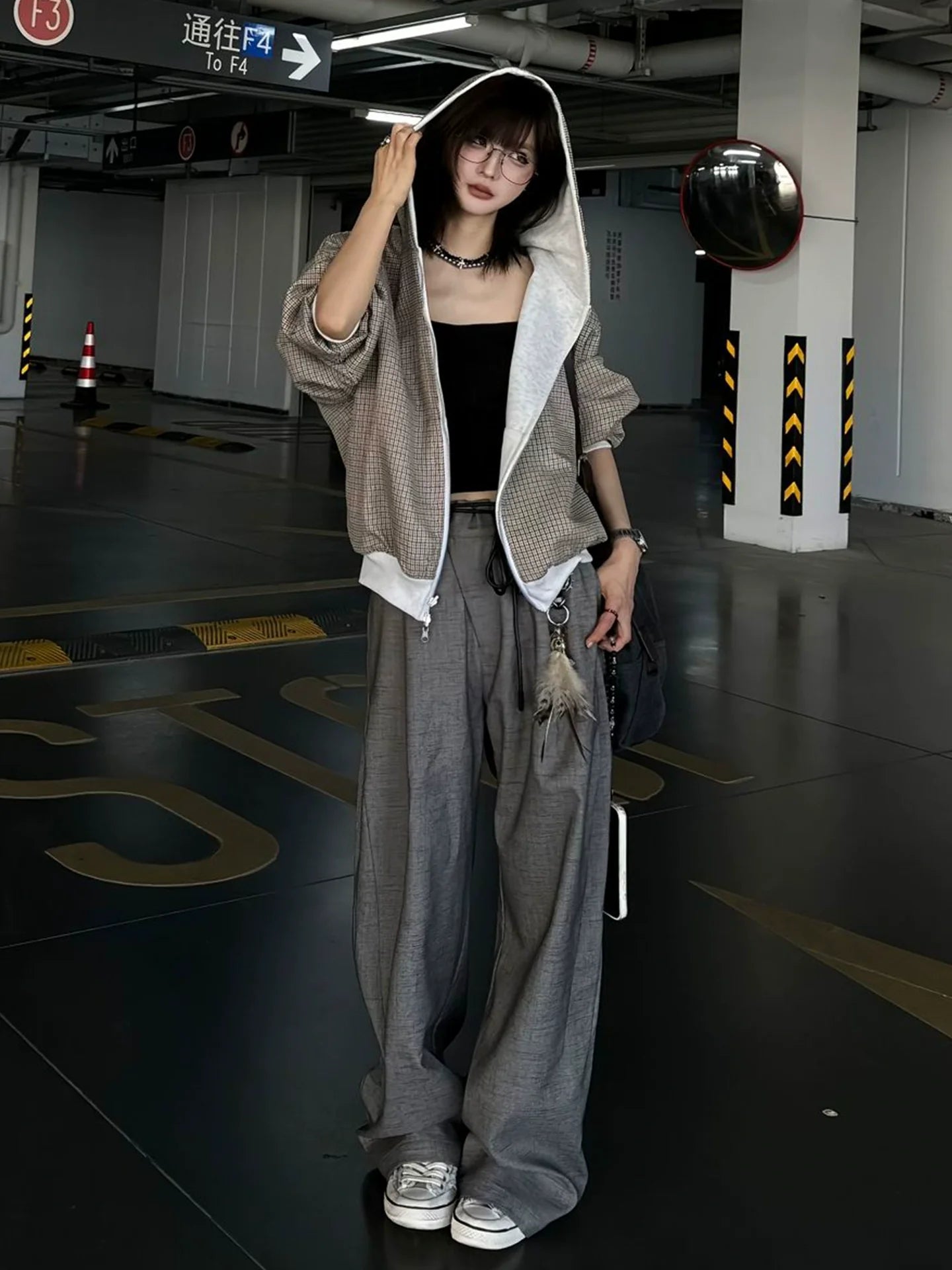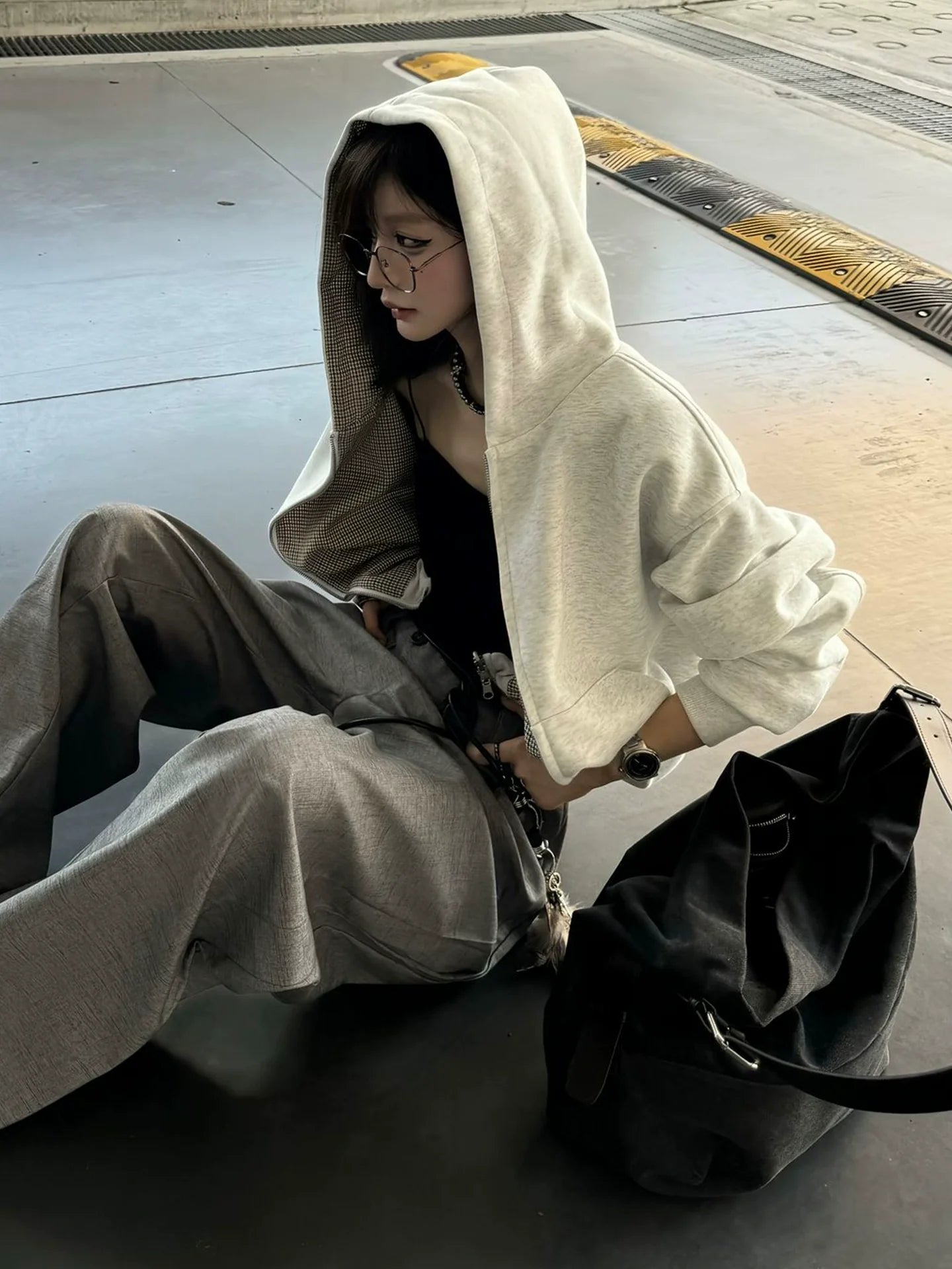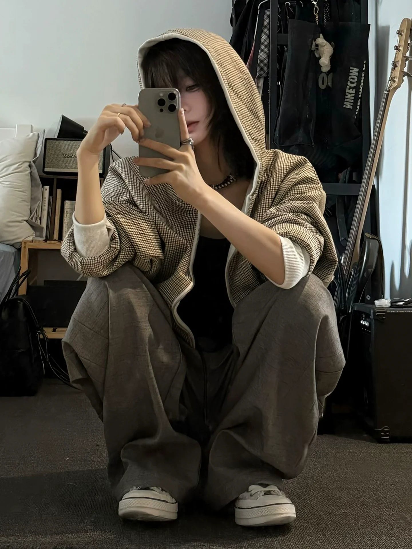 - Top: Autumn-winter short and wide hoodie with classic houndstooth pattern, reversible design, soft cotton blend, cleanfit retro aesthetic.