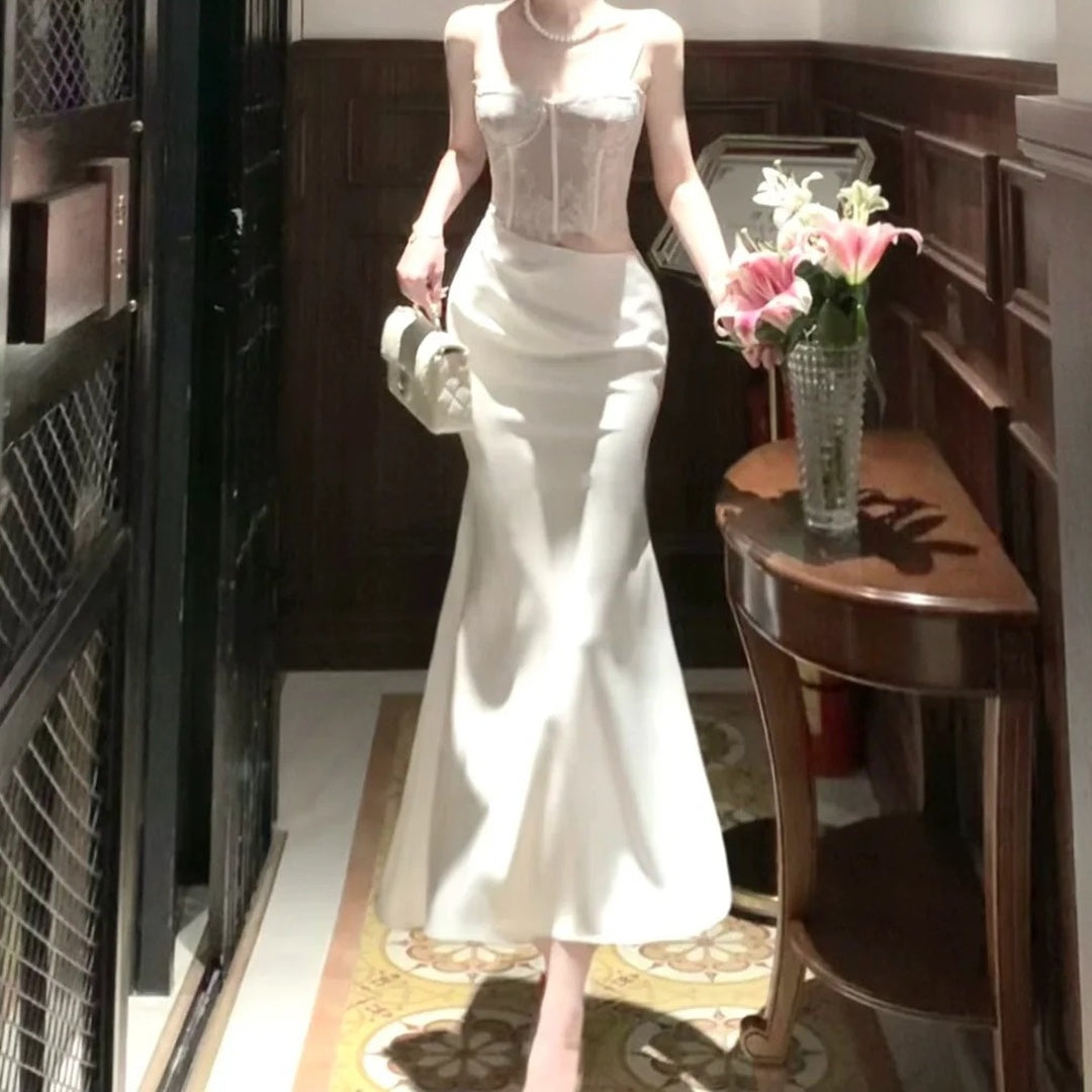 - Elegant French-inspired satin gown with lace overlay, hollow details, and mermaid silhouette. Perfect for prom, weddings, and formal evening events.