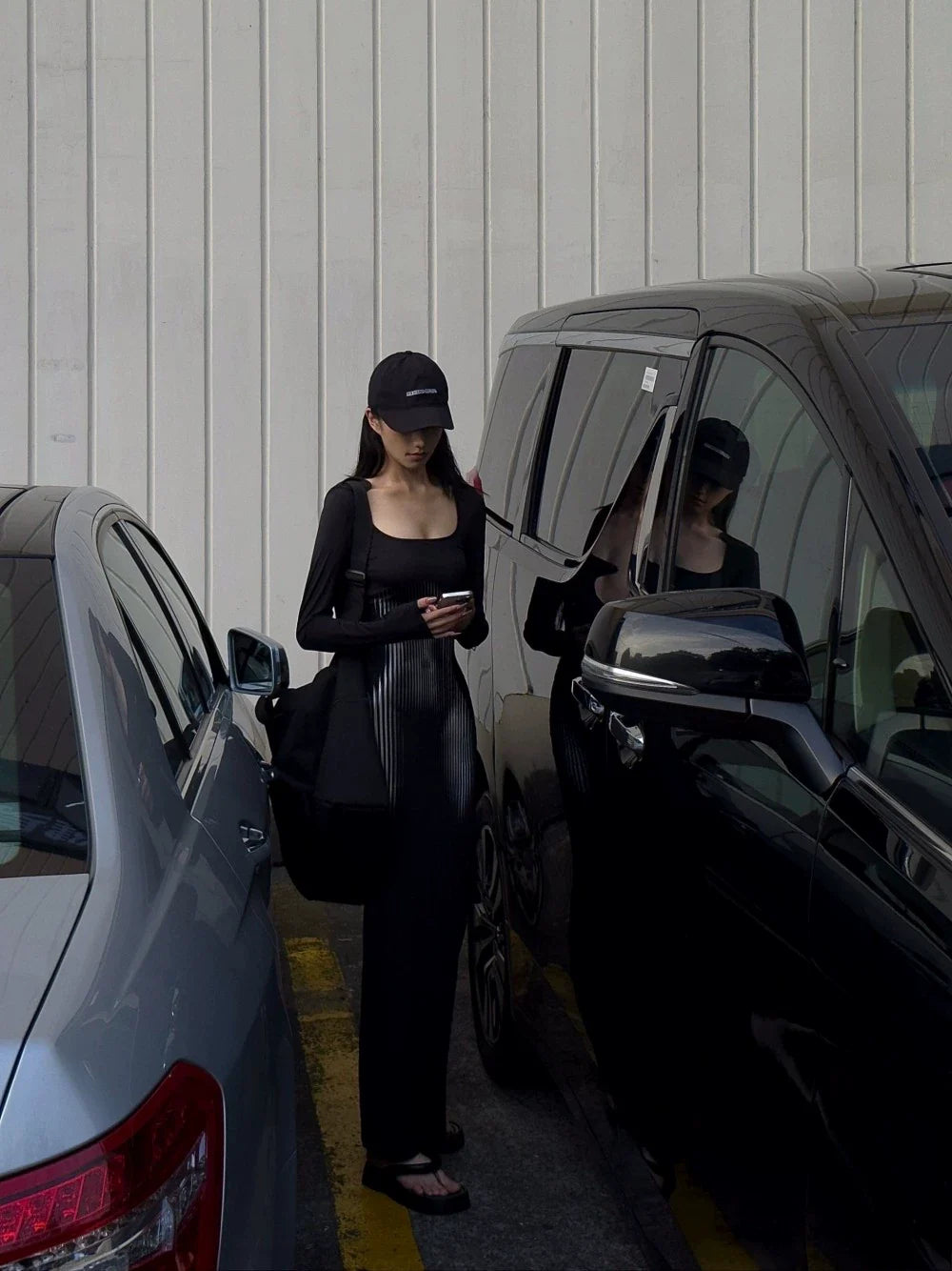 - Dress: A hot early autumn maxi dress with black base and bold prints, long sleeves, and a tight bodycon fit that hugs every curve. Has that soft "pure desire" vibe—super sexy and sleek.
