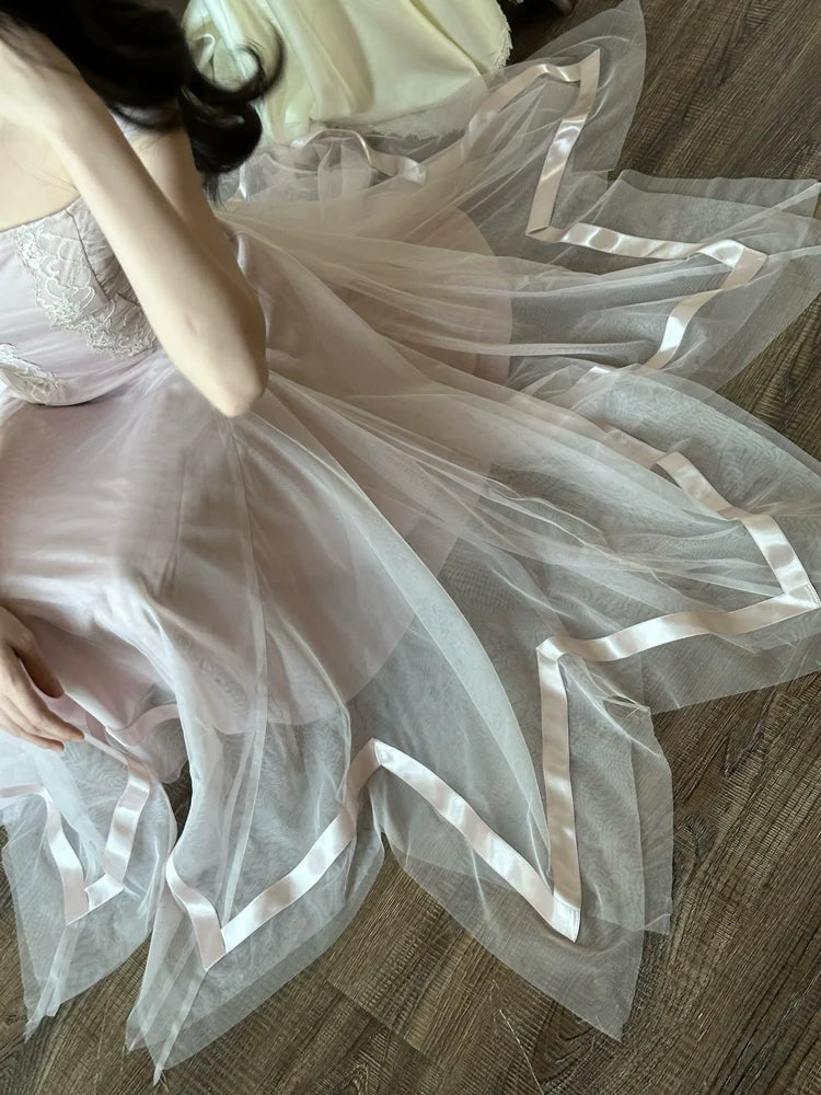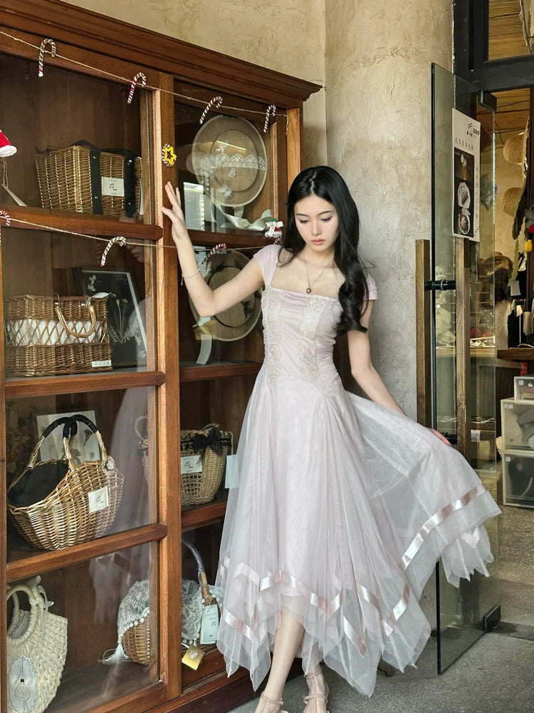 - Dress: Smoky pink maxi dress featuring handcrafted mesh lace and ribbon details. Soft, flowing fabric provides a romantic and elegant look.