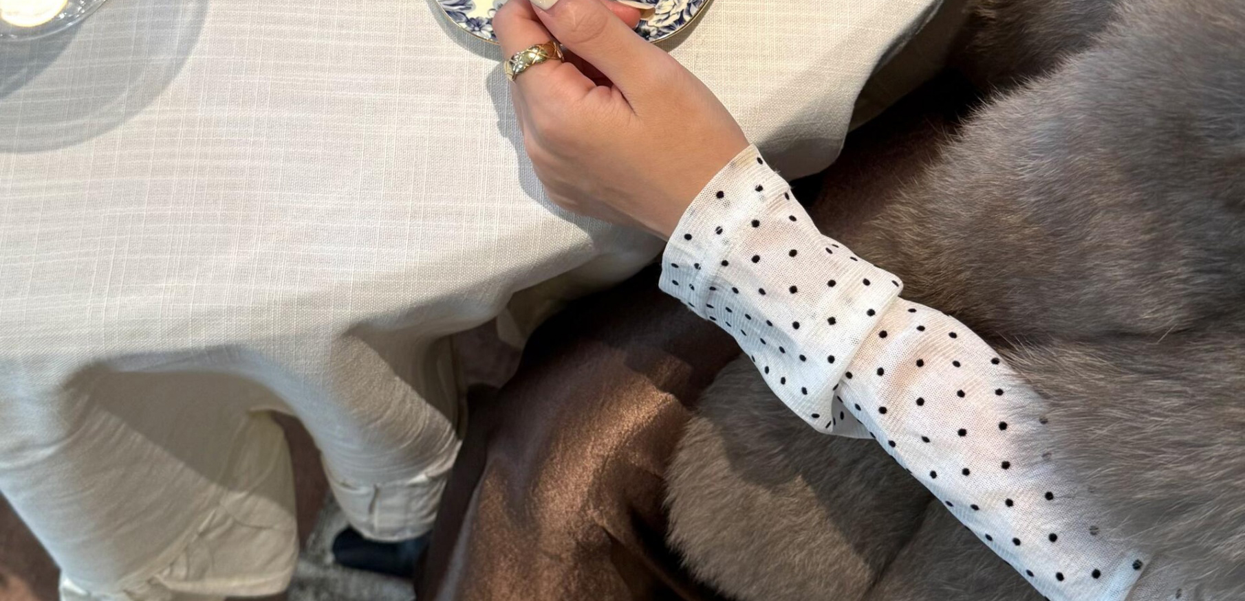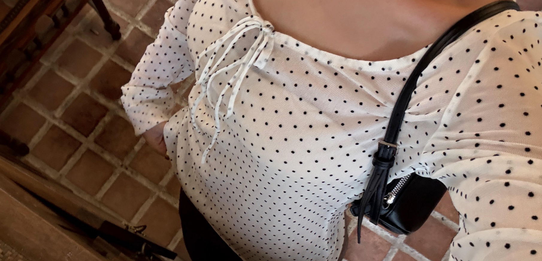 Square neck long sleeve tee with tie and polka mesh overlay. Slim fit and stylish for early autumn wear.