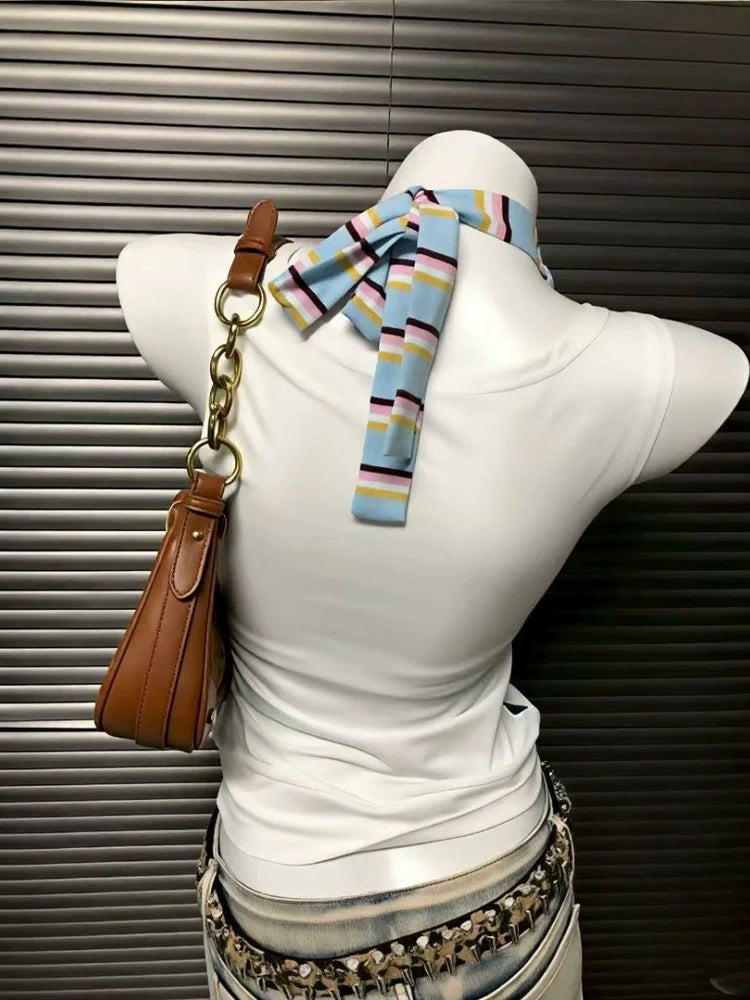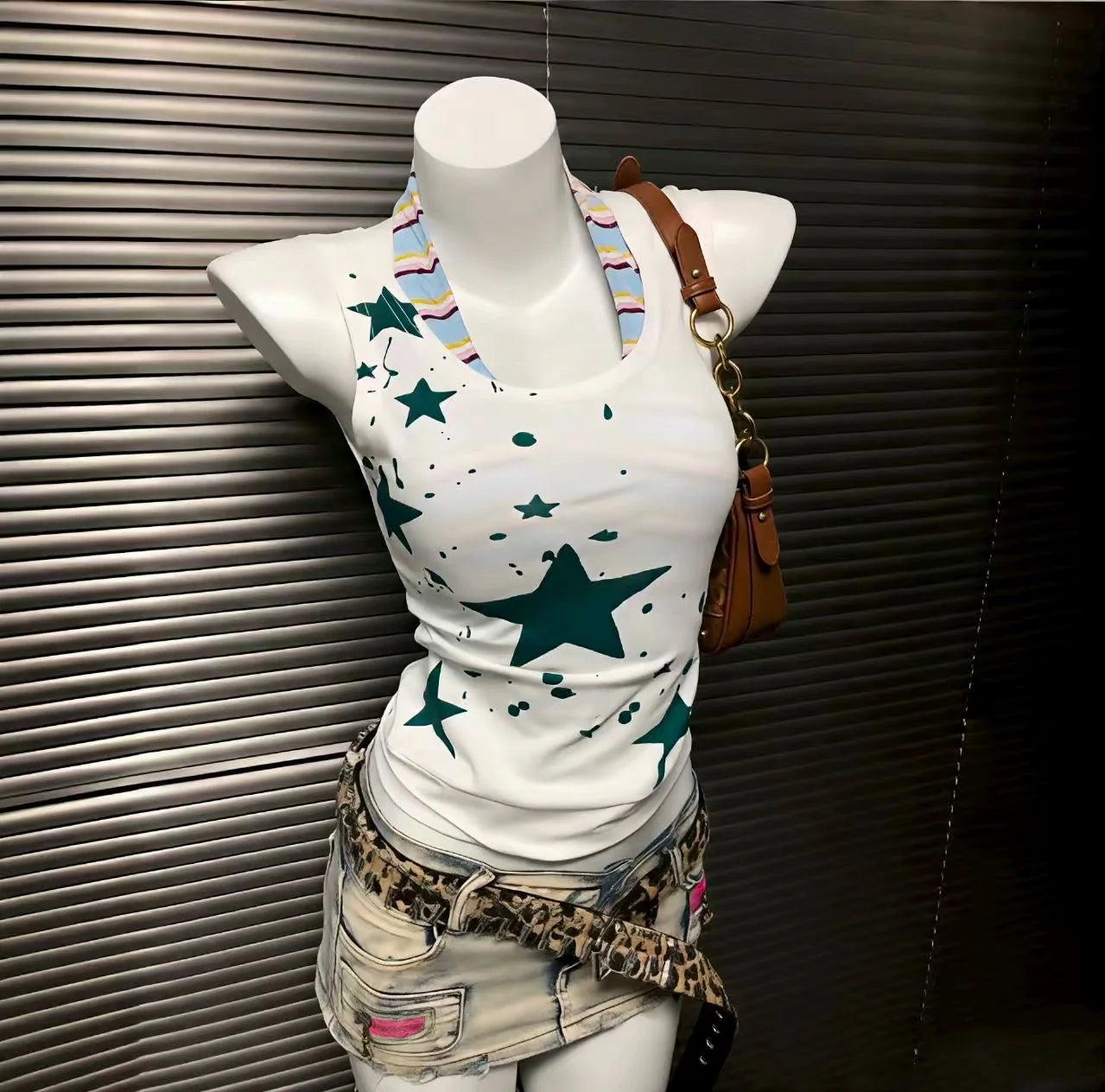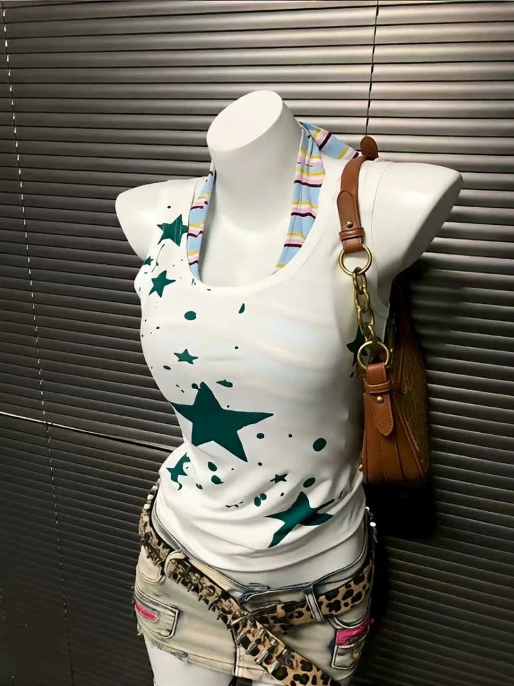 - Top: A stylish two-piece set featuring a star-patterned halter top and a matching crop tee, capturing Y2K subculture () vibes and retro American style.
