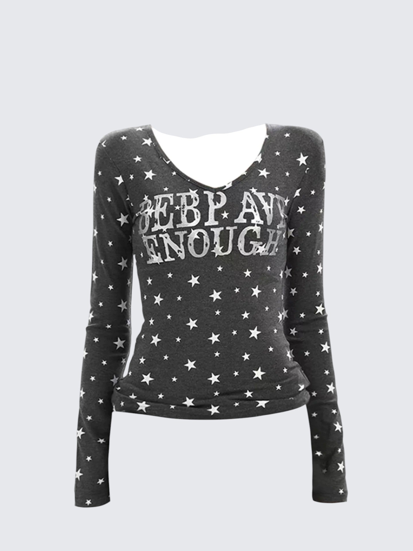 - Top: Grey V-neck long sleeve tee with full star print, slim fit, soft cotton blend.