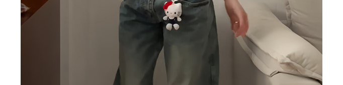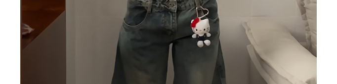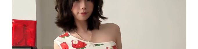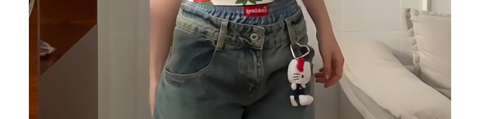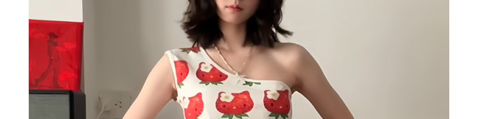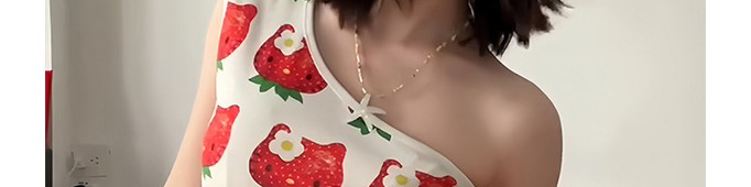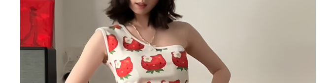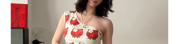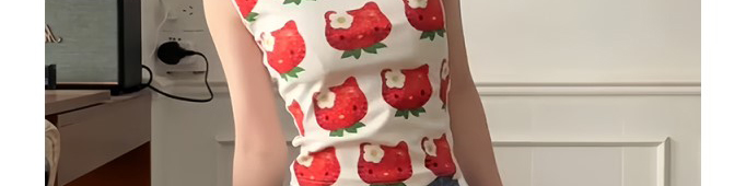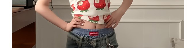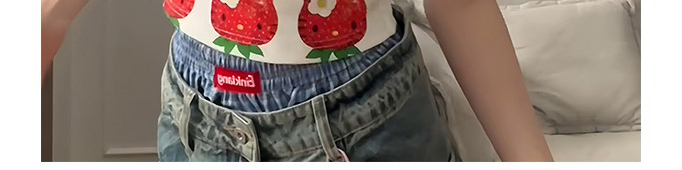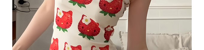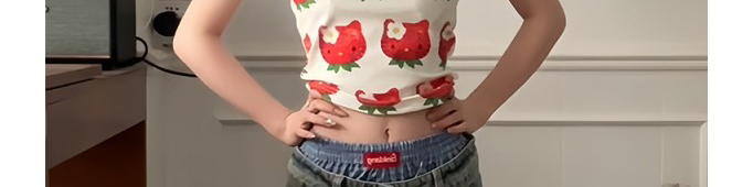 - Top: Playful cropped top with strawberry cat print, off-shoulder cut, and slim-fit stretch fabric.