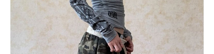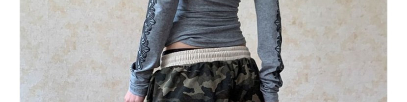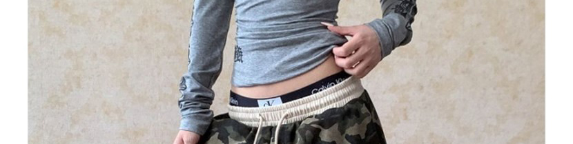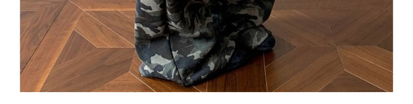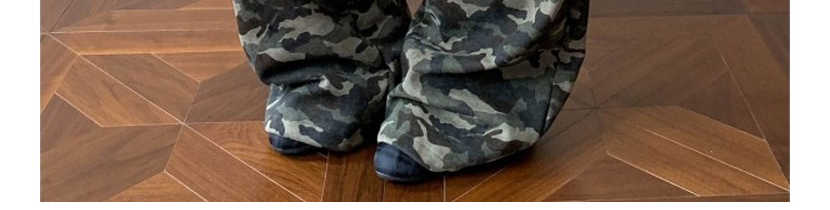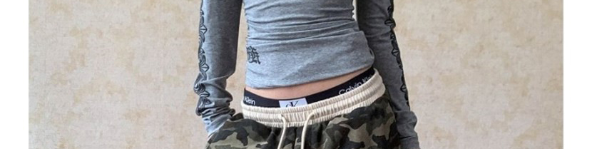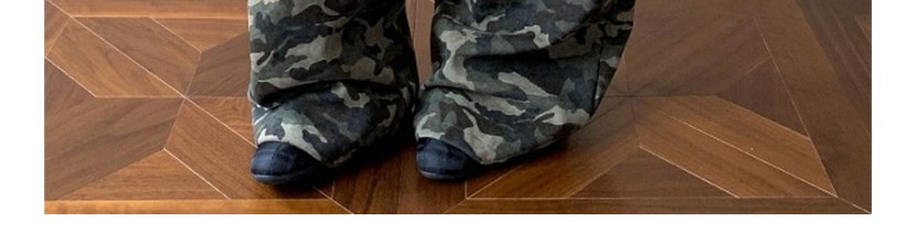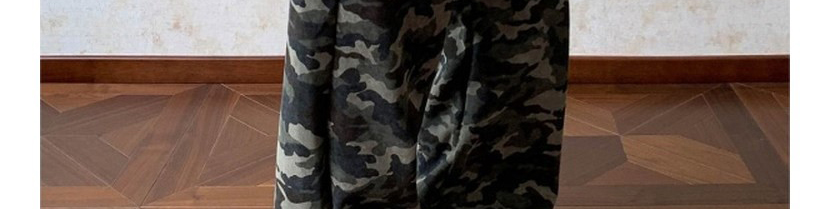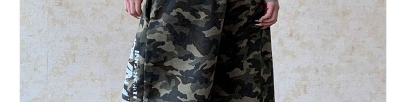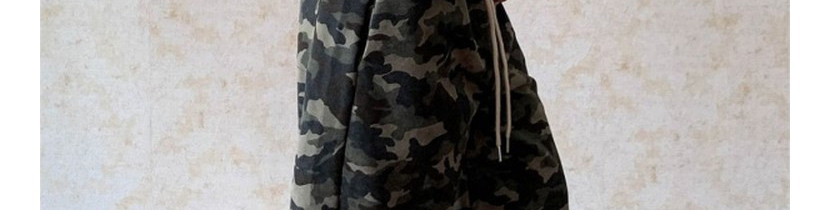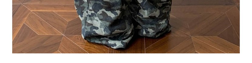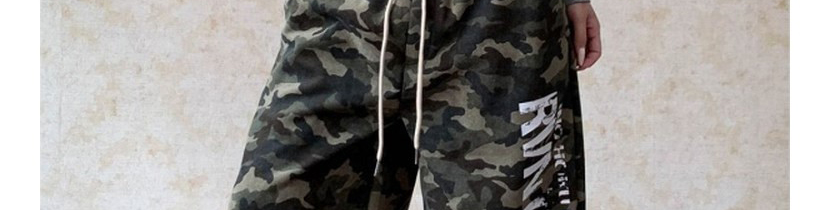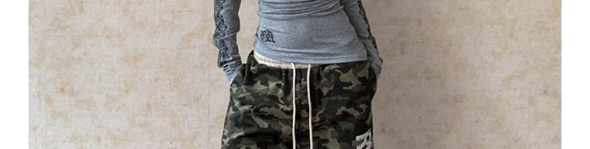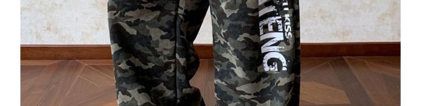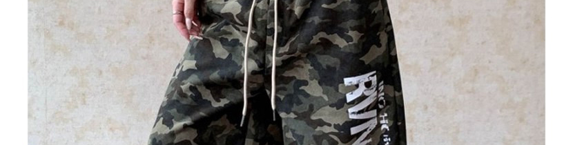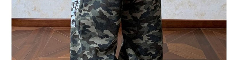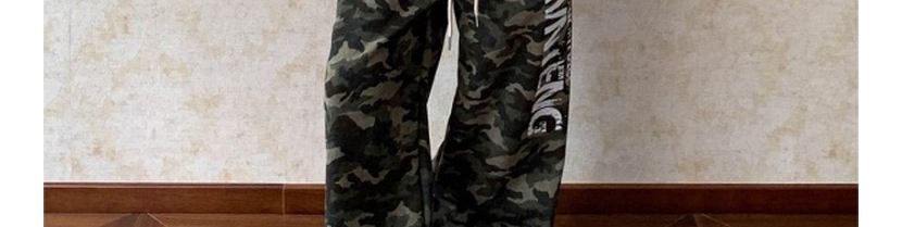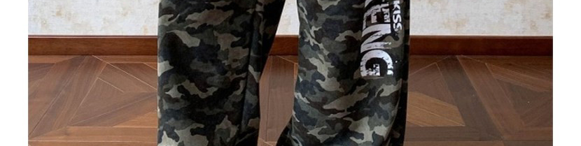 - Pants: Street-style camo print wide-leg pants with bold letter graphics and a relaxed cut.