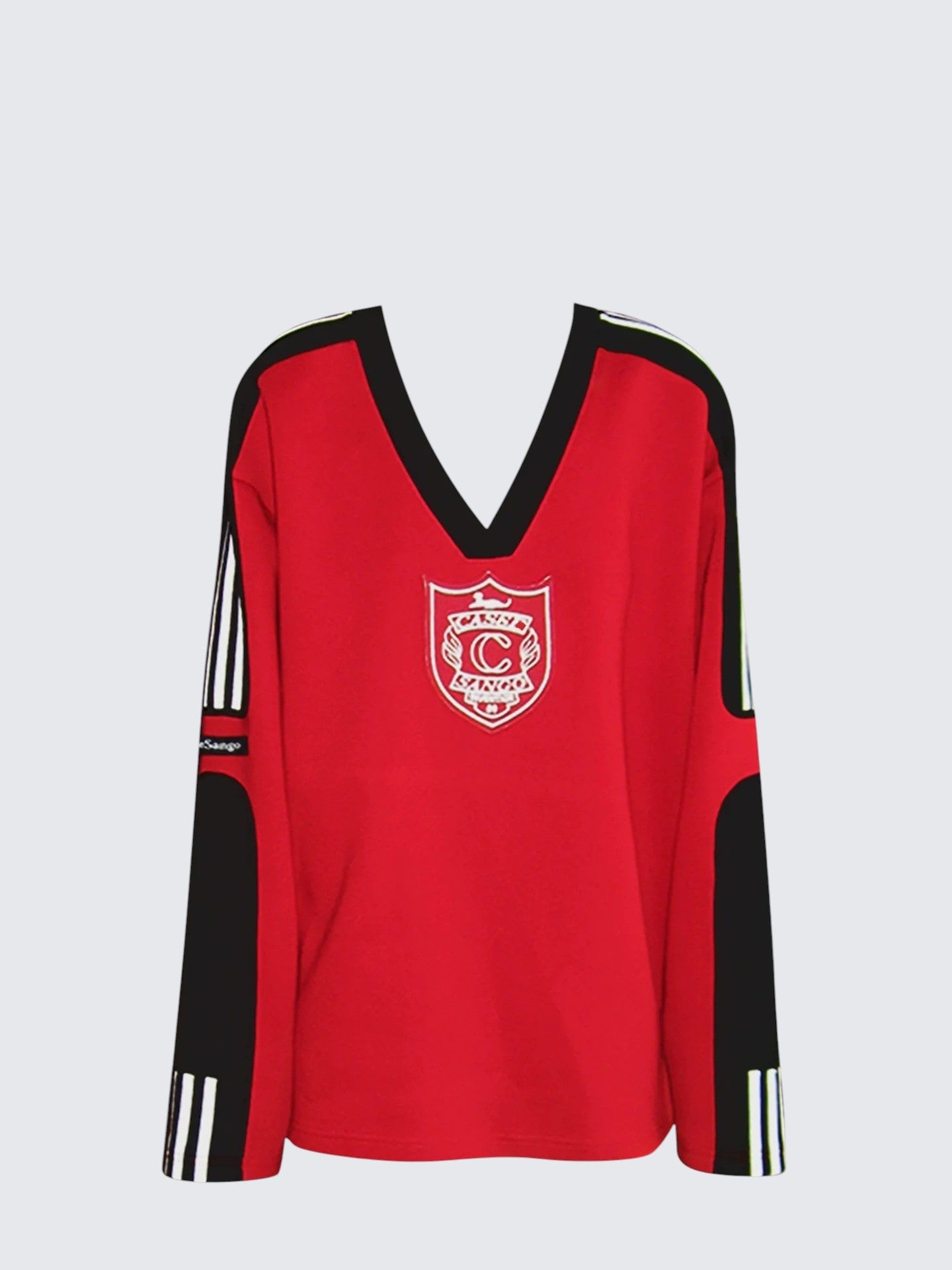 - Top: Heavyweight V-neck hoodie with bold stripe color-block, relaxed fit, long sleeves, unisex design.