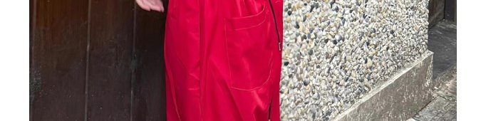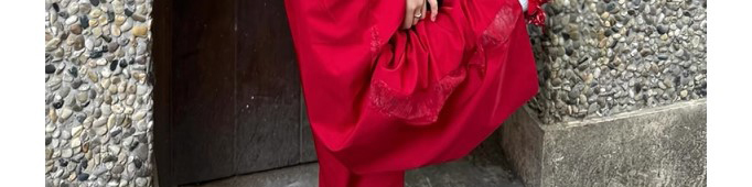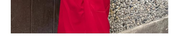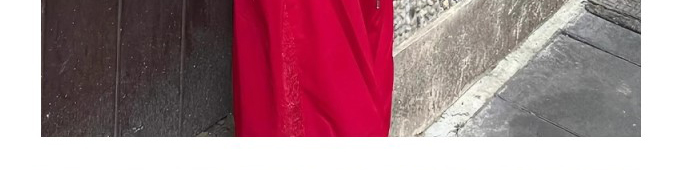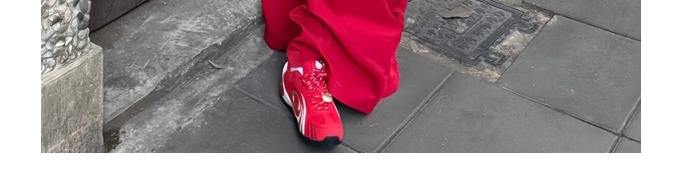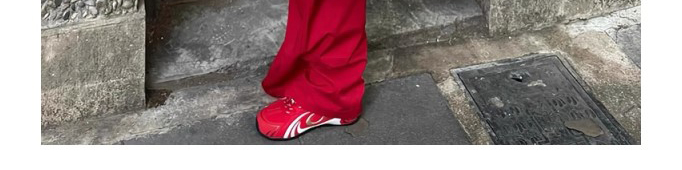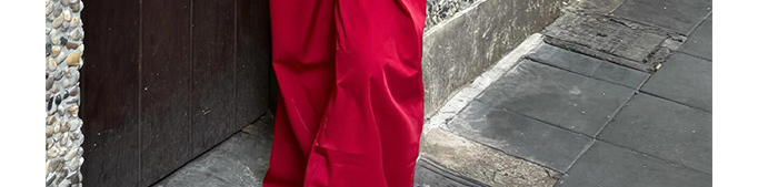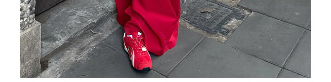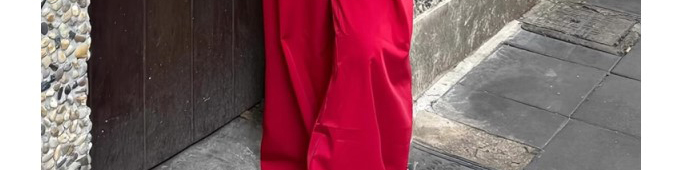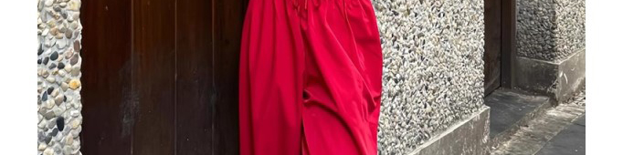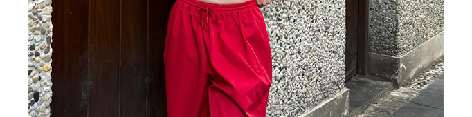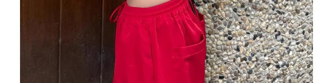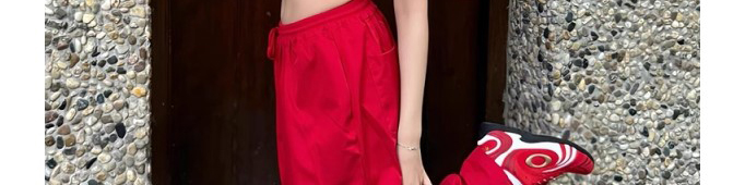 - Pants: Loose-fit red wide-leg pants with straight cut, breathable for summer comfort.