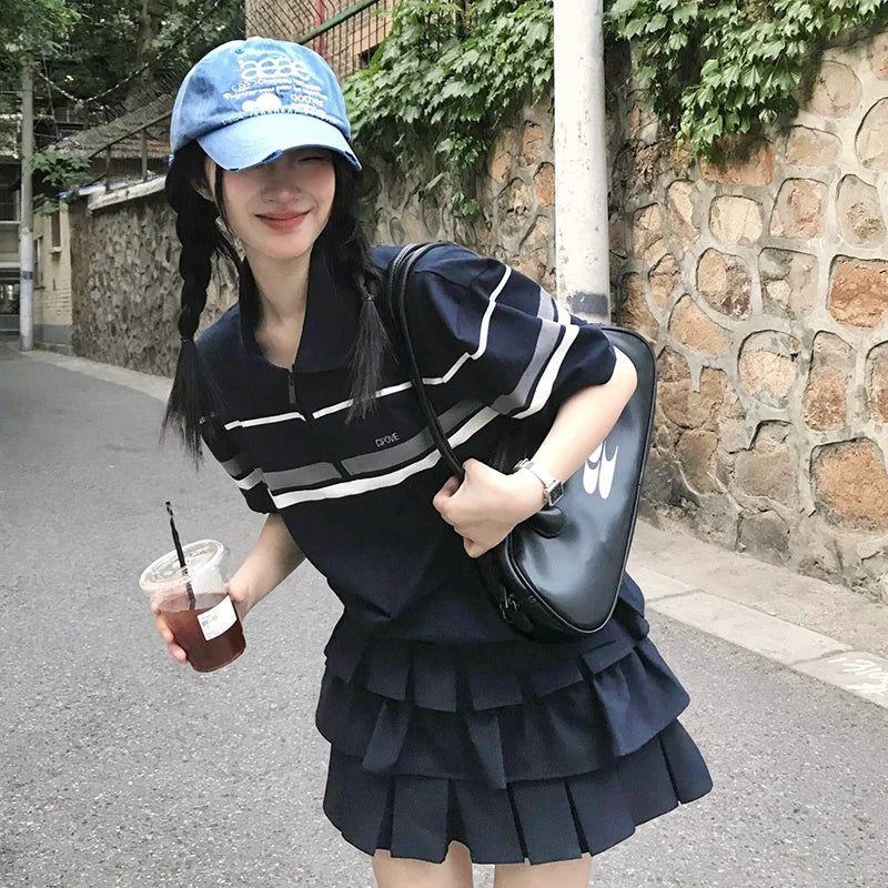 - Top: Striped polo shirt with puff sleeves, half-zip front, and short cropped design.