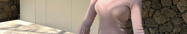 - Top: Slim-fit knit top with off-shoulder neckline and flared long sleeves, soft early autumn fabric.