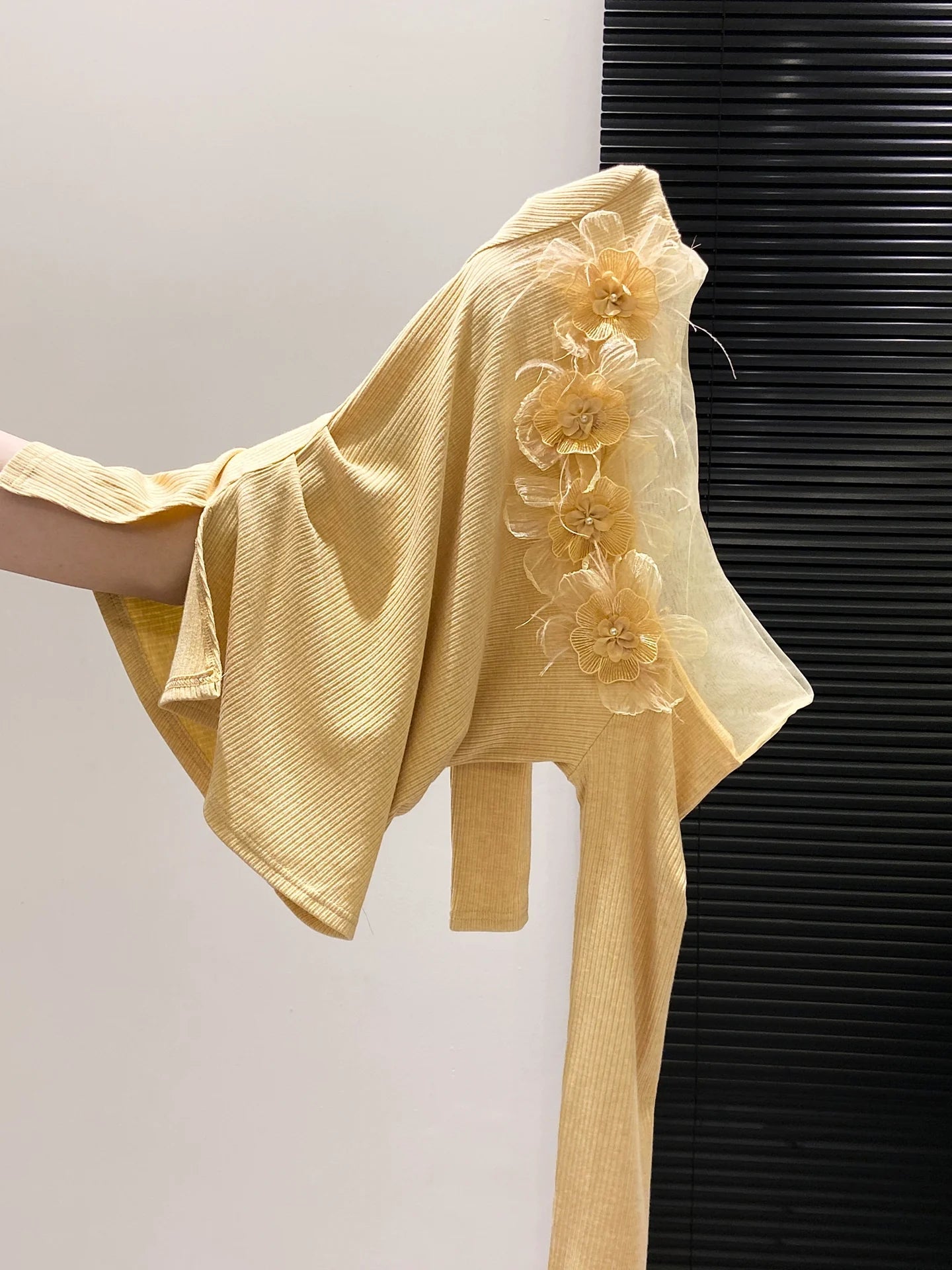 - Top: A stylish early autumn base layer top with one-of-a-kind details—sheer lace tulle fabric, a flattering off-the-shoulder cut, and cute 3D flower accents. It’s slim-fitting to highlight your shape, with long sleeves that keep you comfy as temperatures drop. Great for wearing alone or layering under jackets or cardigans.