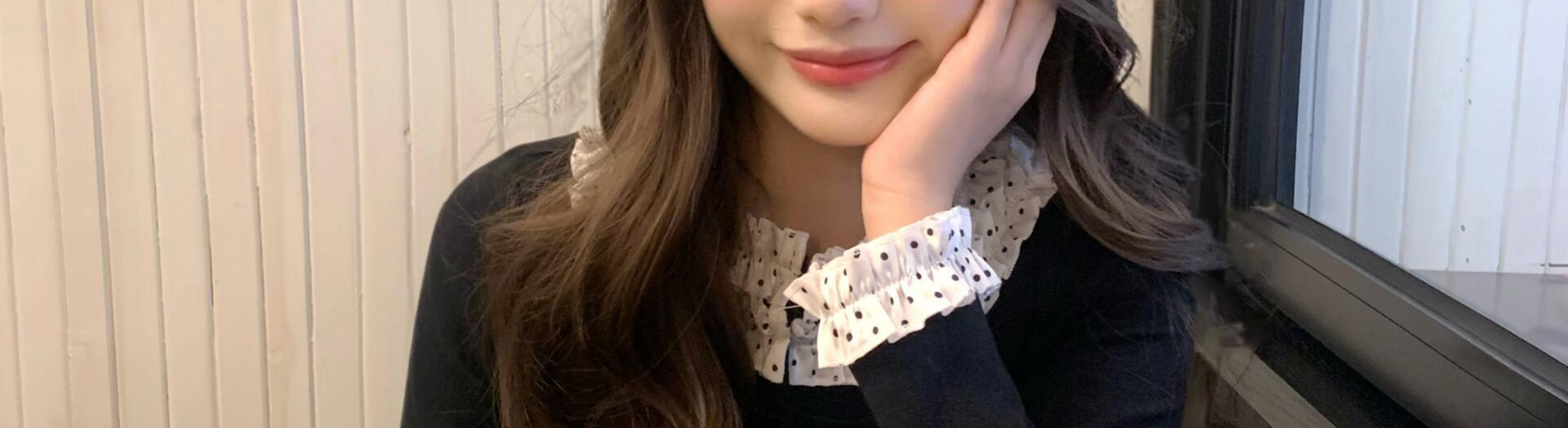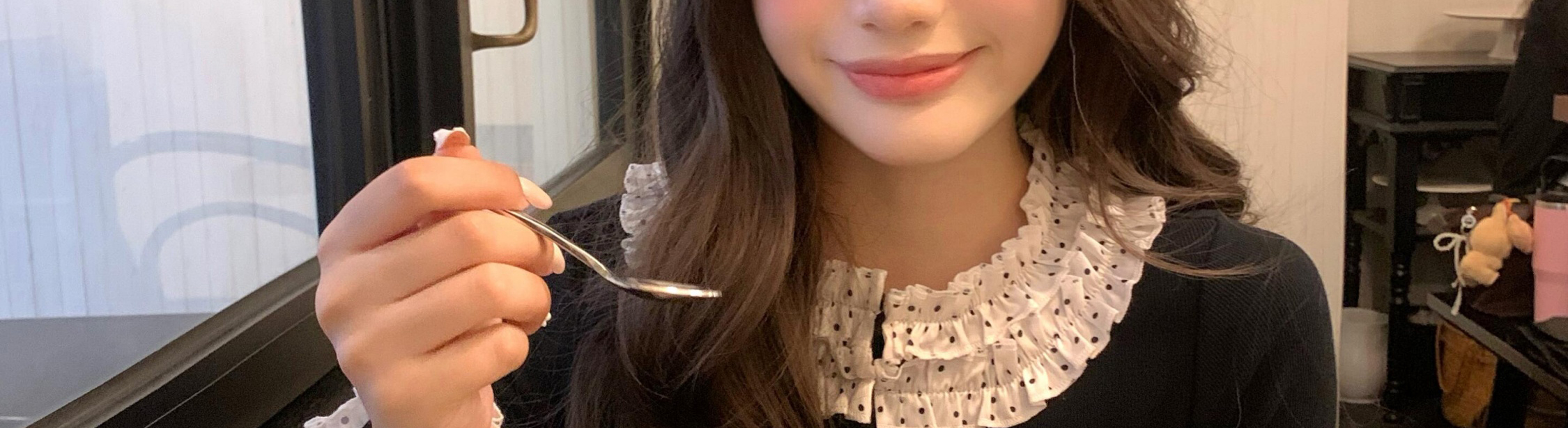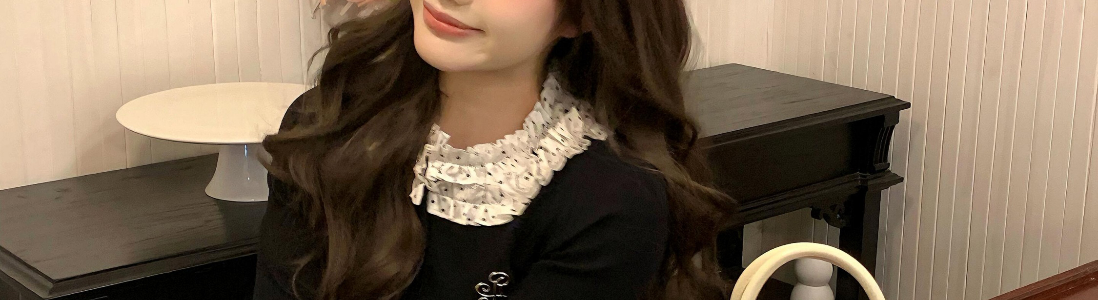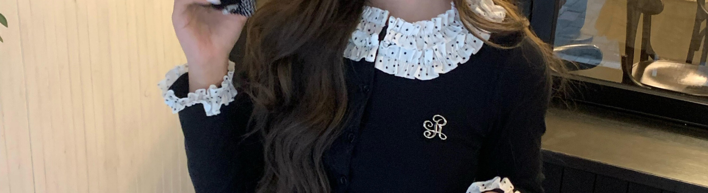 - Top: Short, slim-fit long sleeve knit tee in black with polka dot lace patch details, soft stretch fabric.