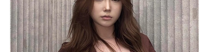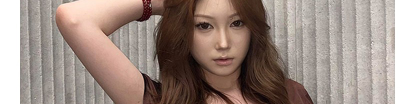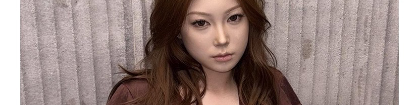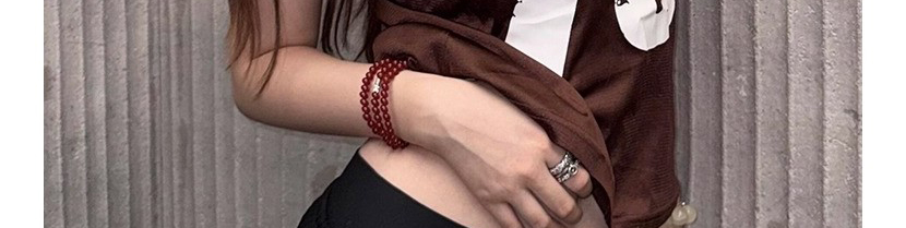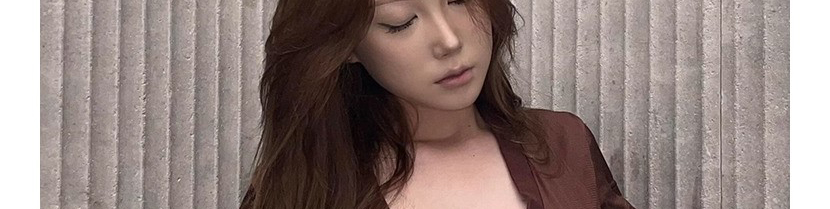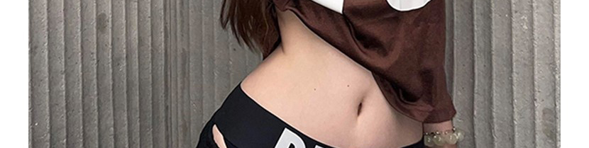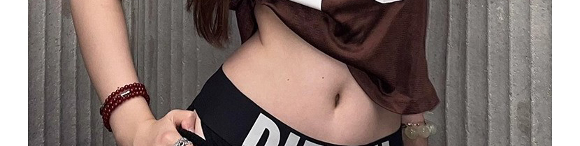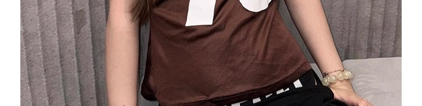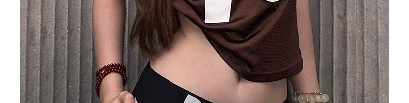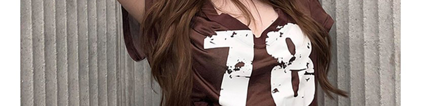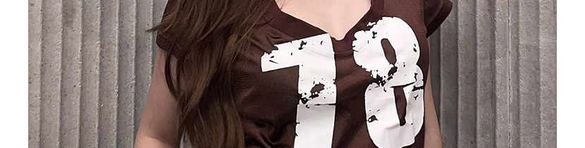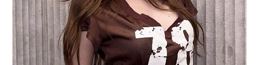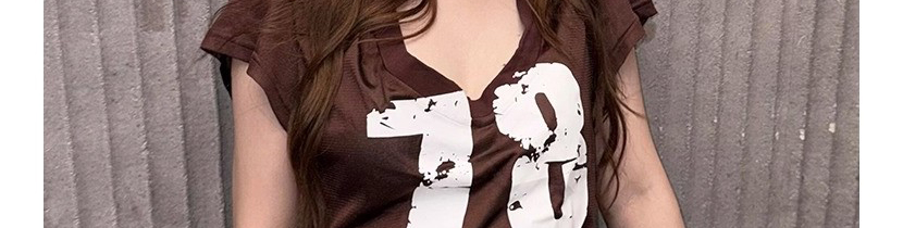 - Top: Slim-fit short sleeve tee with deep V-neck and number print, soft summer fabric, brown tone.