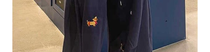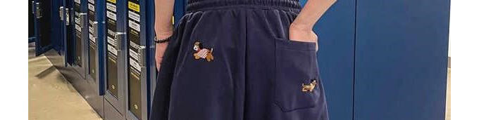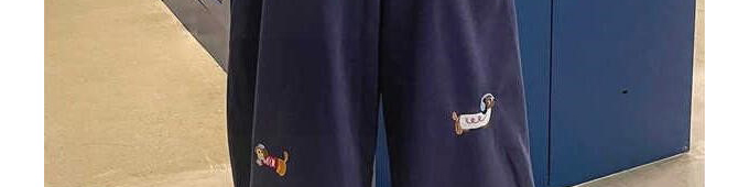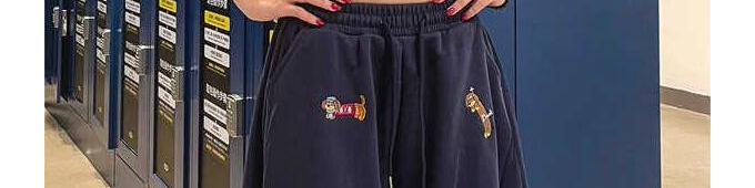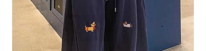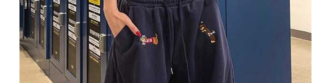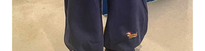 - Pants: Loose-fit sweatpants with dachshund embroidery, soft autumn fabric, wide-leg retro style.