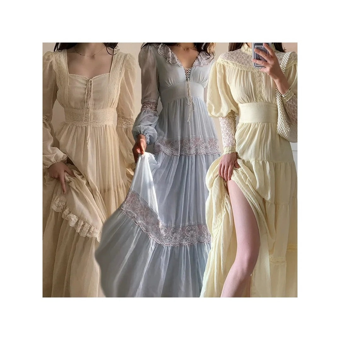 - French-inspired vintage court gown with lace detailing and fitted waist. Elegant, royal-inspired style for sophisticated occasions.