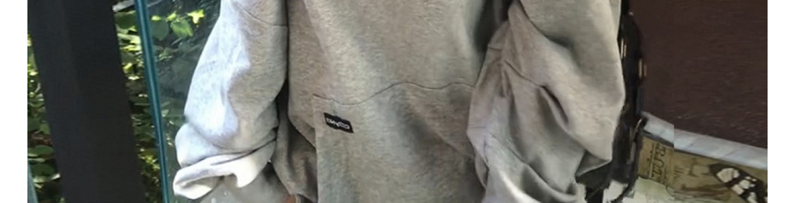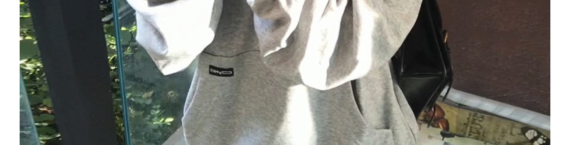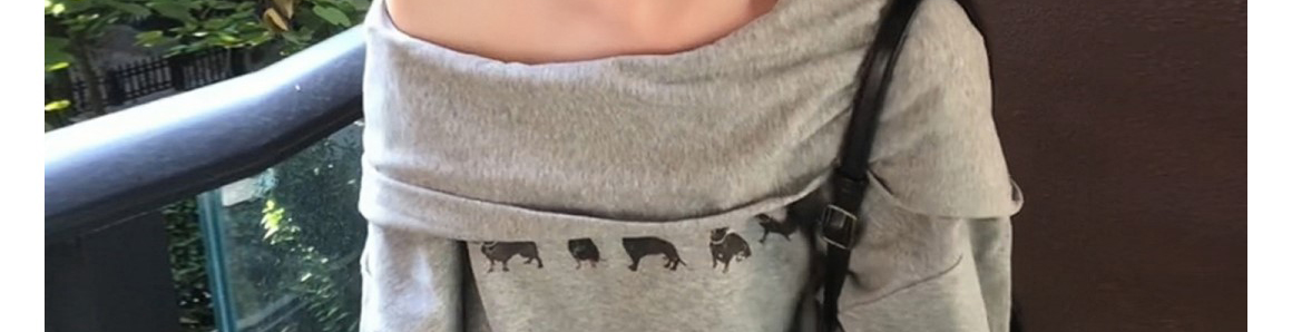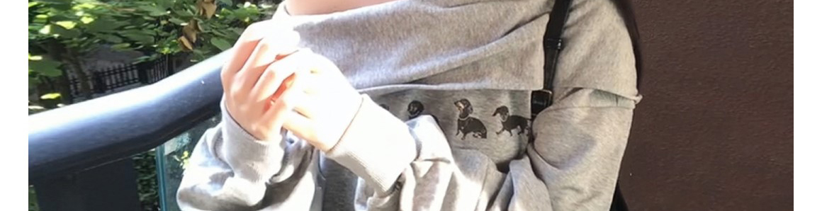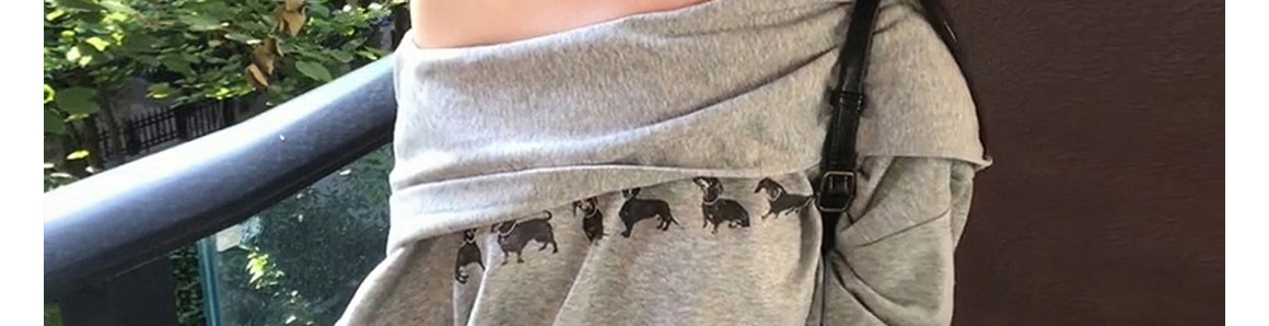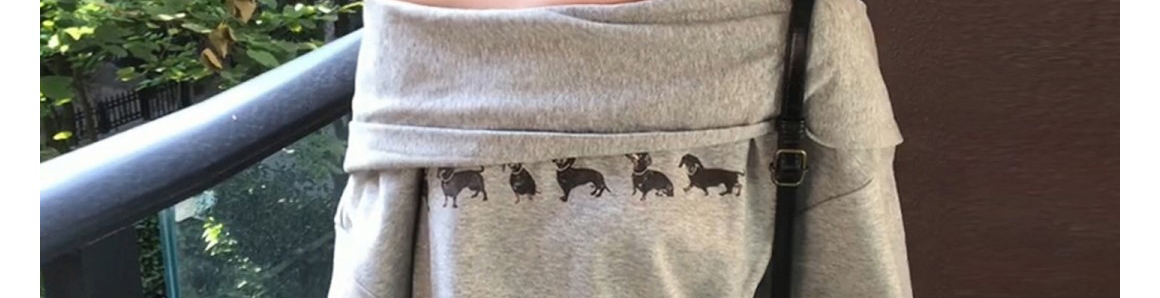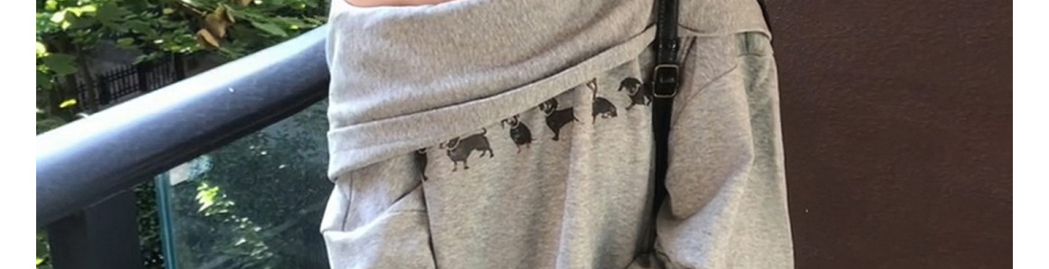 - Top: Heavyweight long sleeve hoodie with one-shoulder dachshund print, loose-fit, soft autumn fabric.