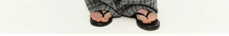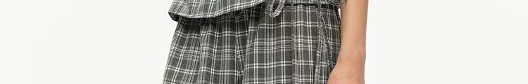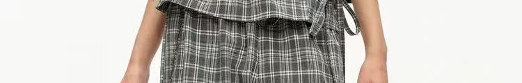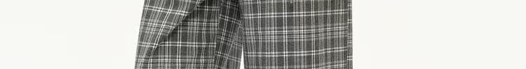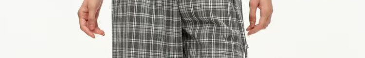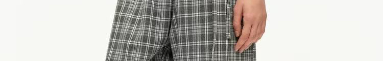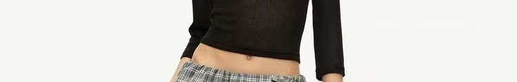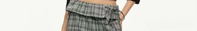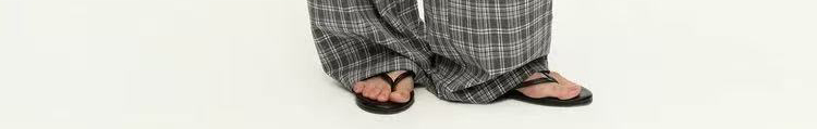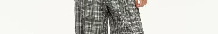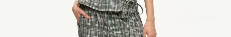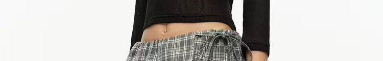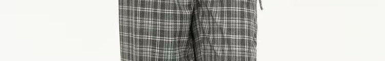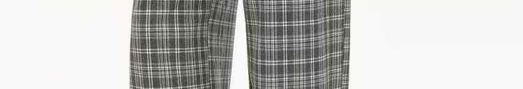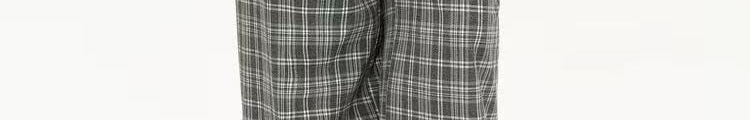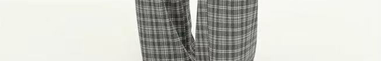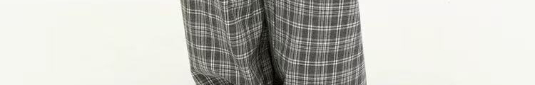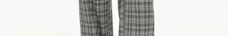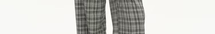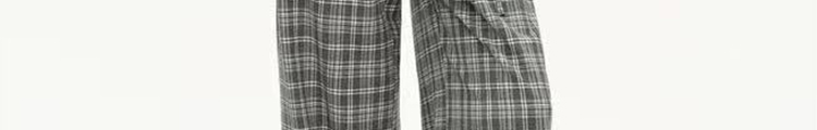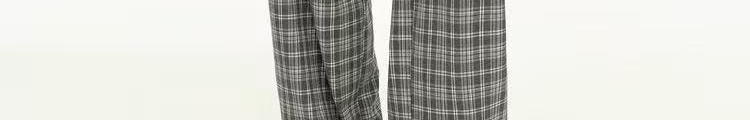 - Pants: Loose-fit straight-leg pants with plaid pattern and folded waistband, soft autumn fabric.