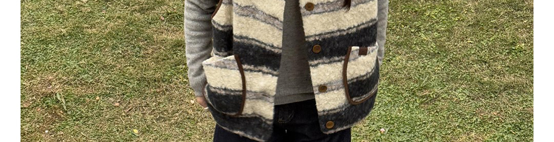 - Top: Sleeveless shearling vest with color-block striped design, warm and soft autumn-winter fabric.