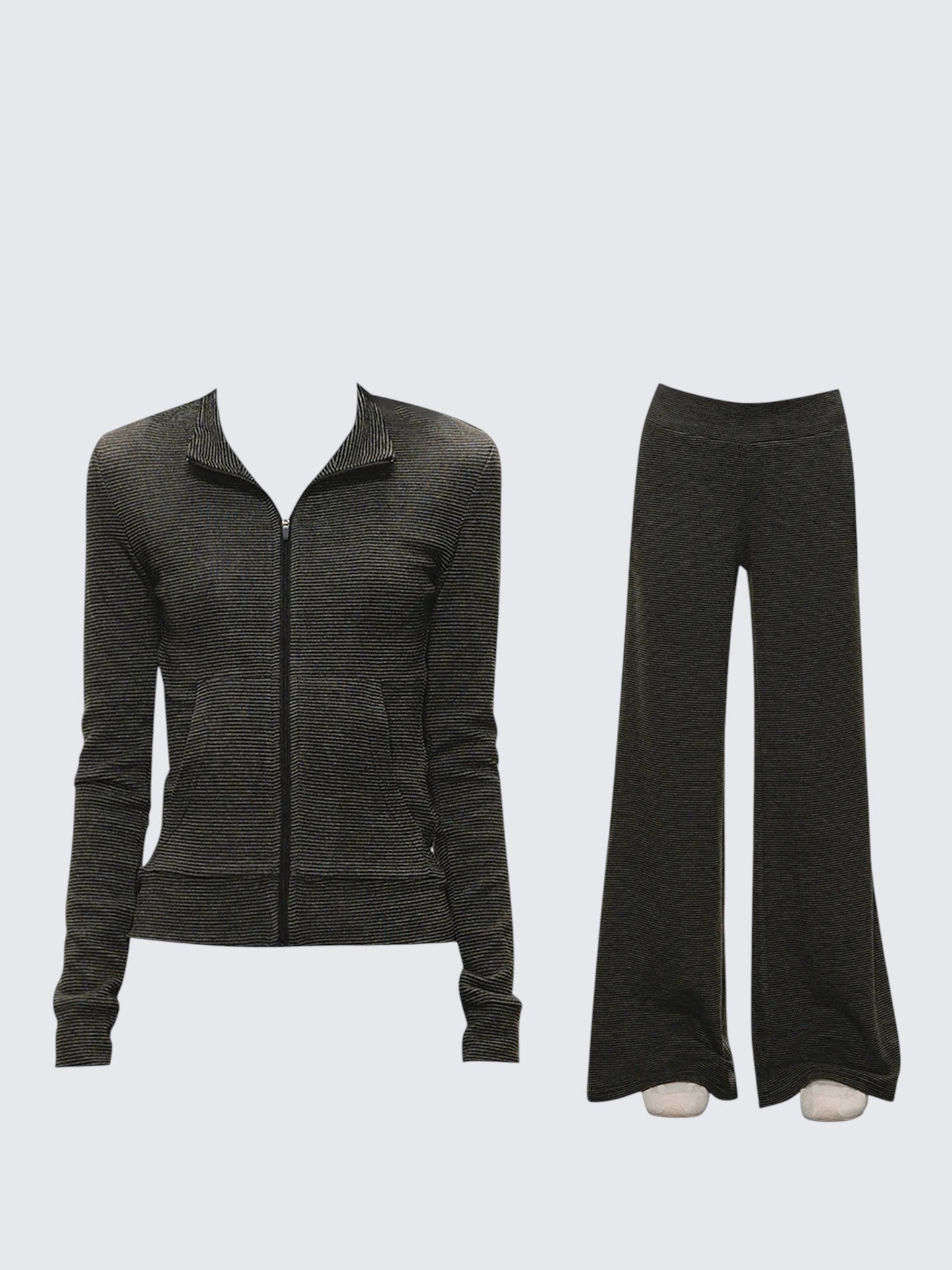 - Top: Two-piece knit set with striped cardigan and matching pants, soft autumn fabric, relaxed sporty fit.