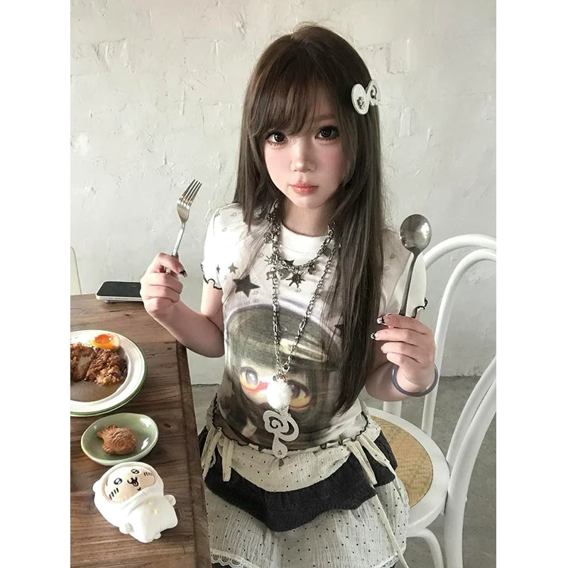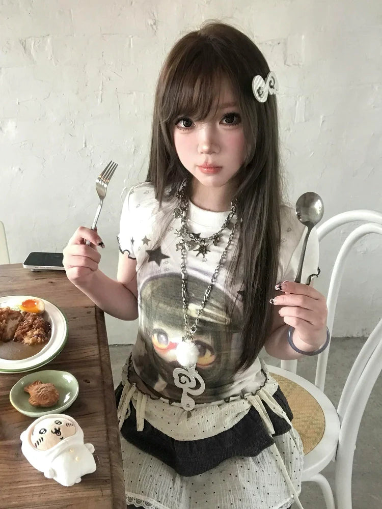 - Top: Summer Y2K-inspired white short sleeve tee with ruffle edge, cropped fit, lightweight soft cotton, subtle vintage aesthetic.