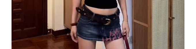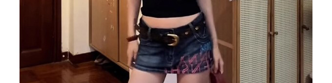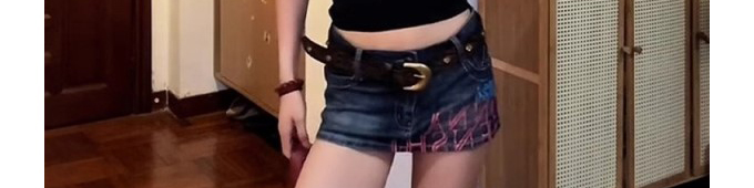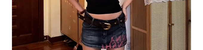 - Skirt: Low-rise mini denim skirt with washed vintage finish and distressed details for a Y2K summer look.