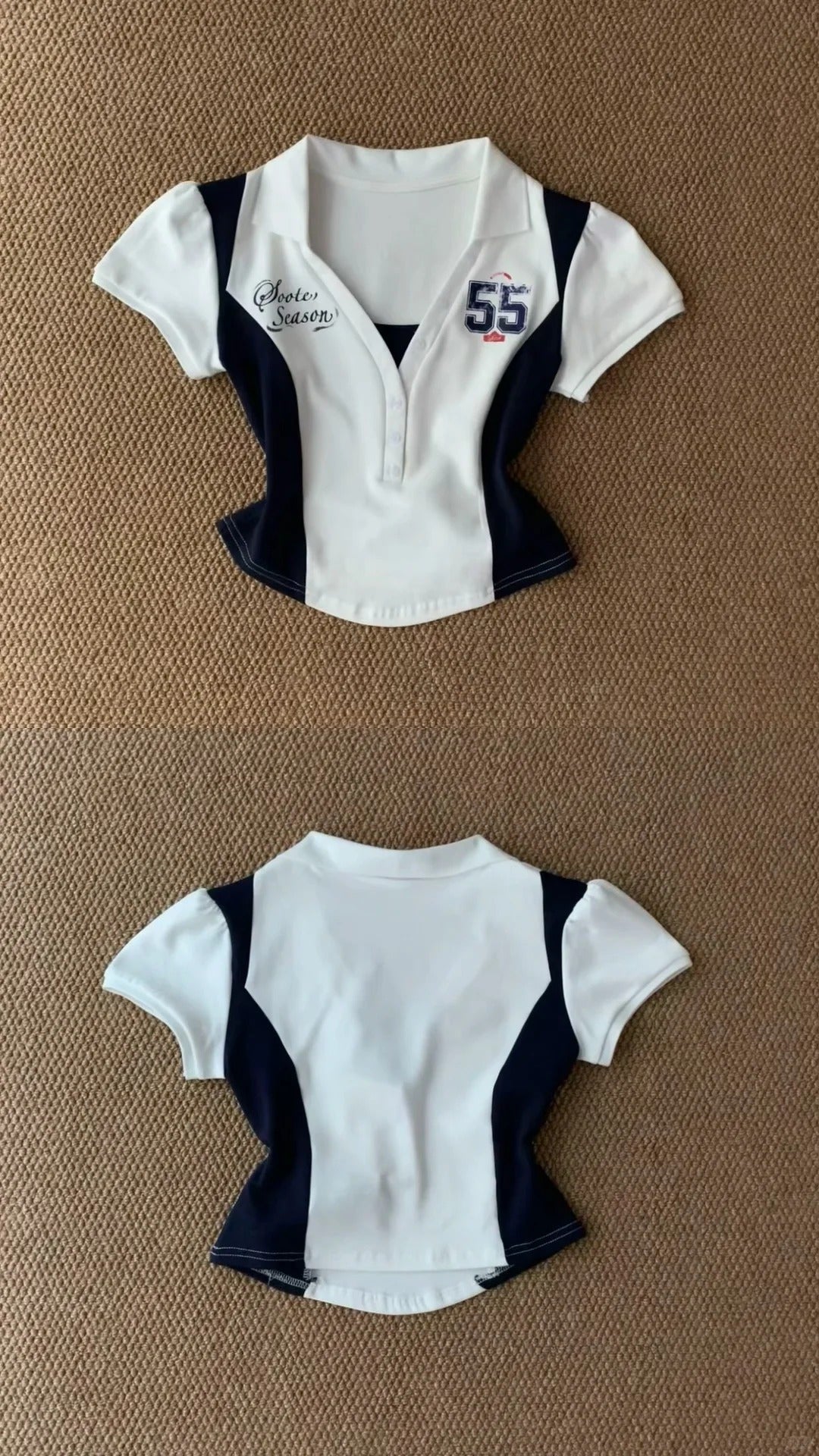 - Top: White and black colorblock collared crop tee with sporty Y2K edge.