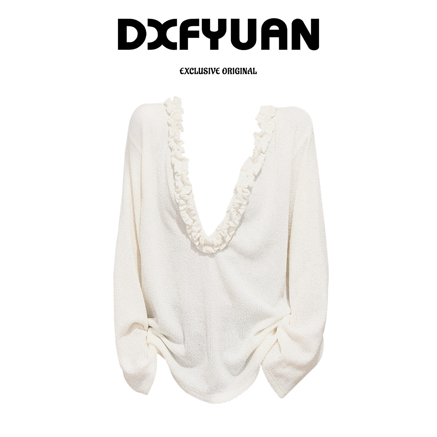 - Top: Loose-fit white long sleeve tee with frill edges and V-neck, lightweight early autumn fabric with casual aesthetic.