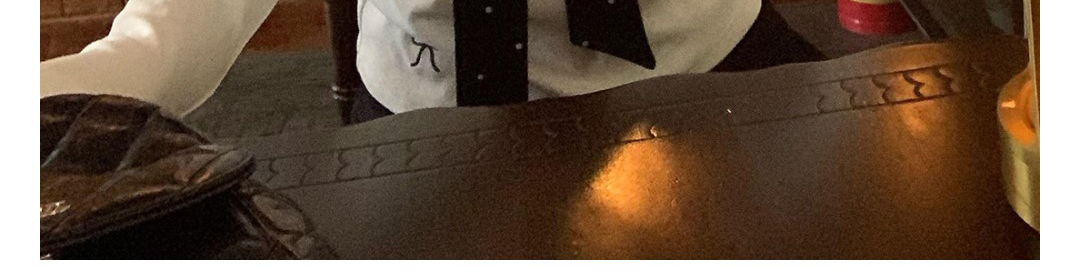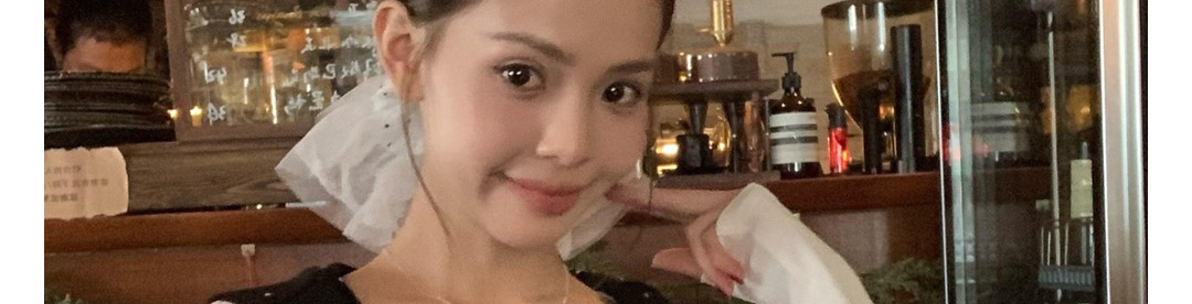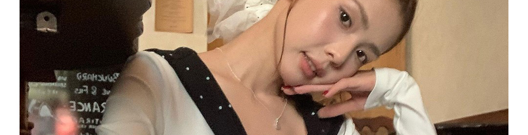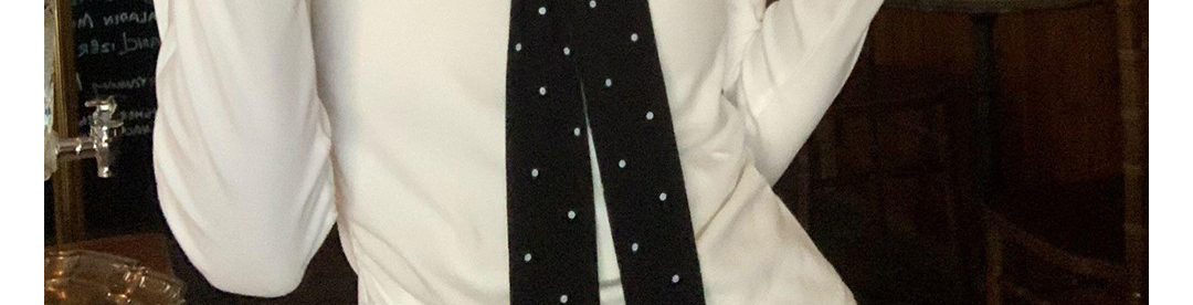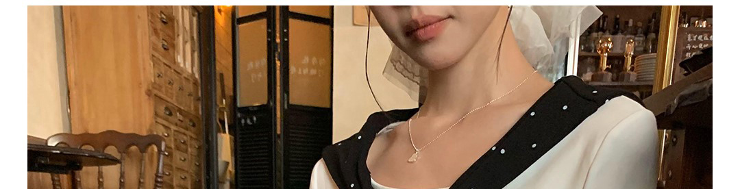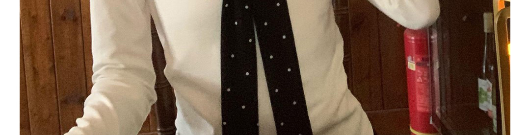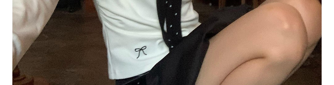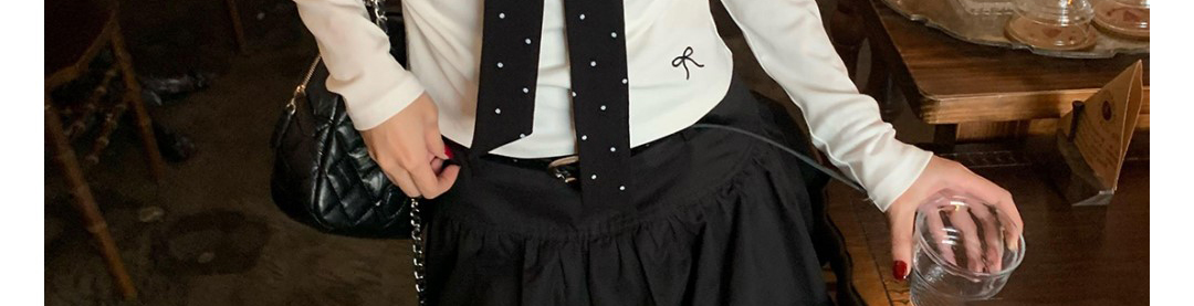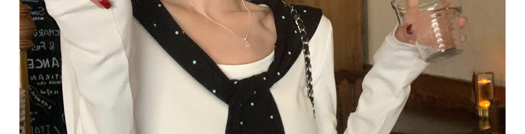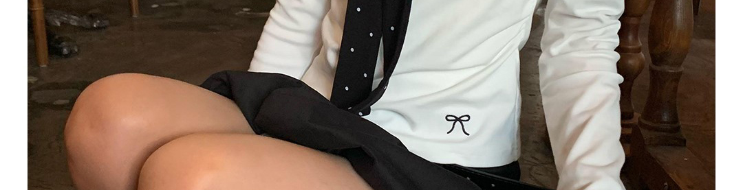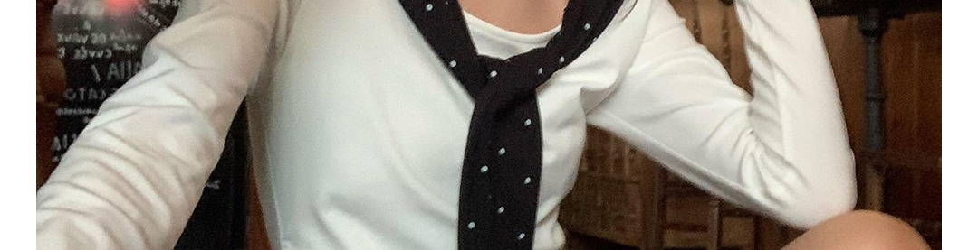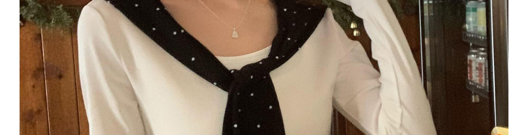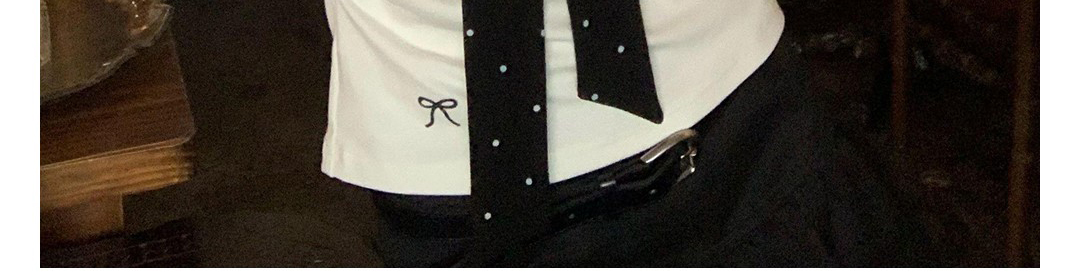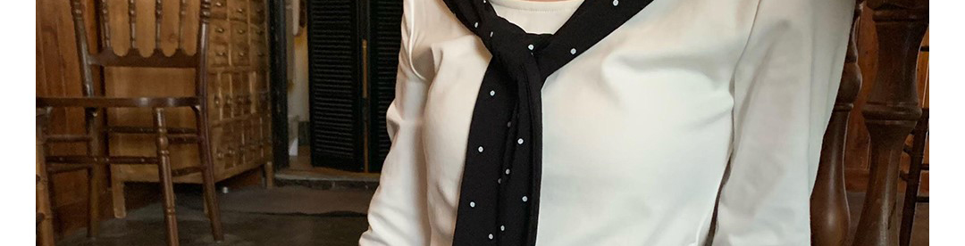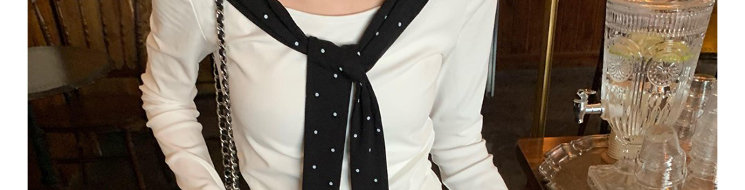 Korean-style white polka dot tee with draped shoulders and bow detail. Slim fit for autumn layering.