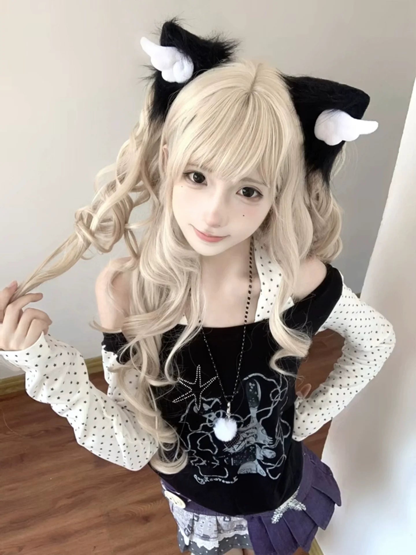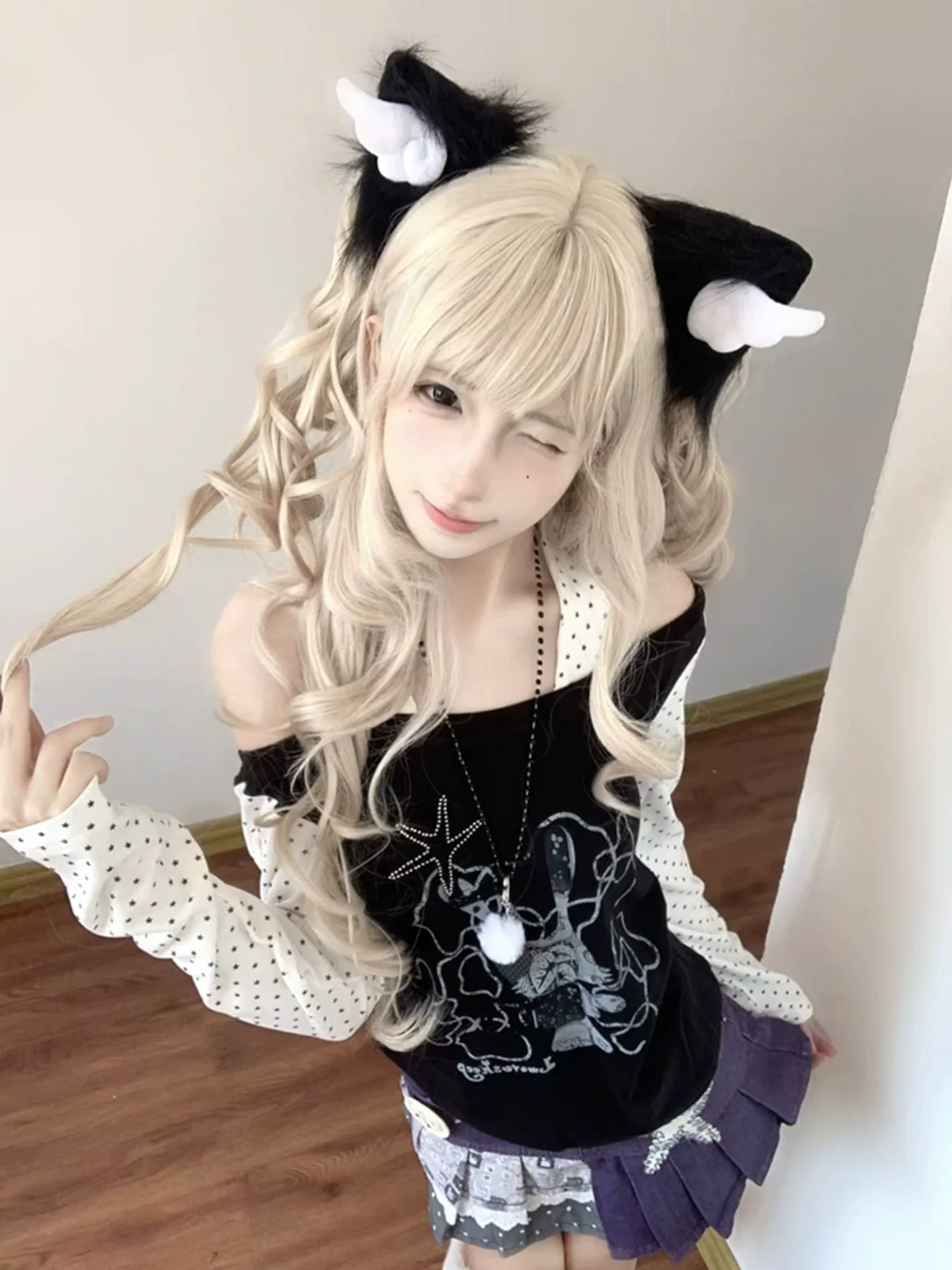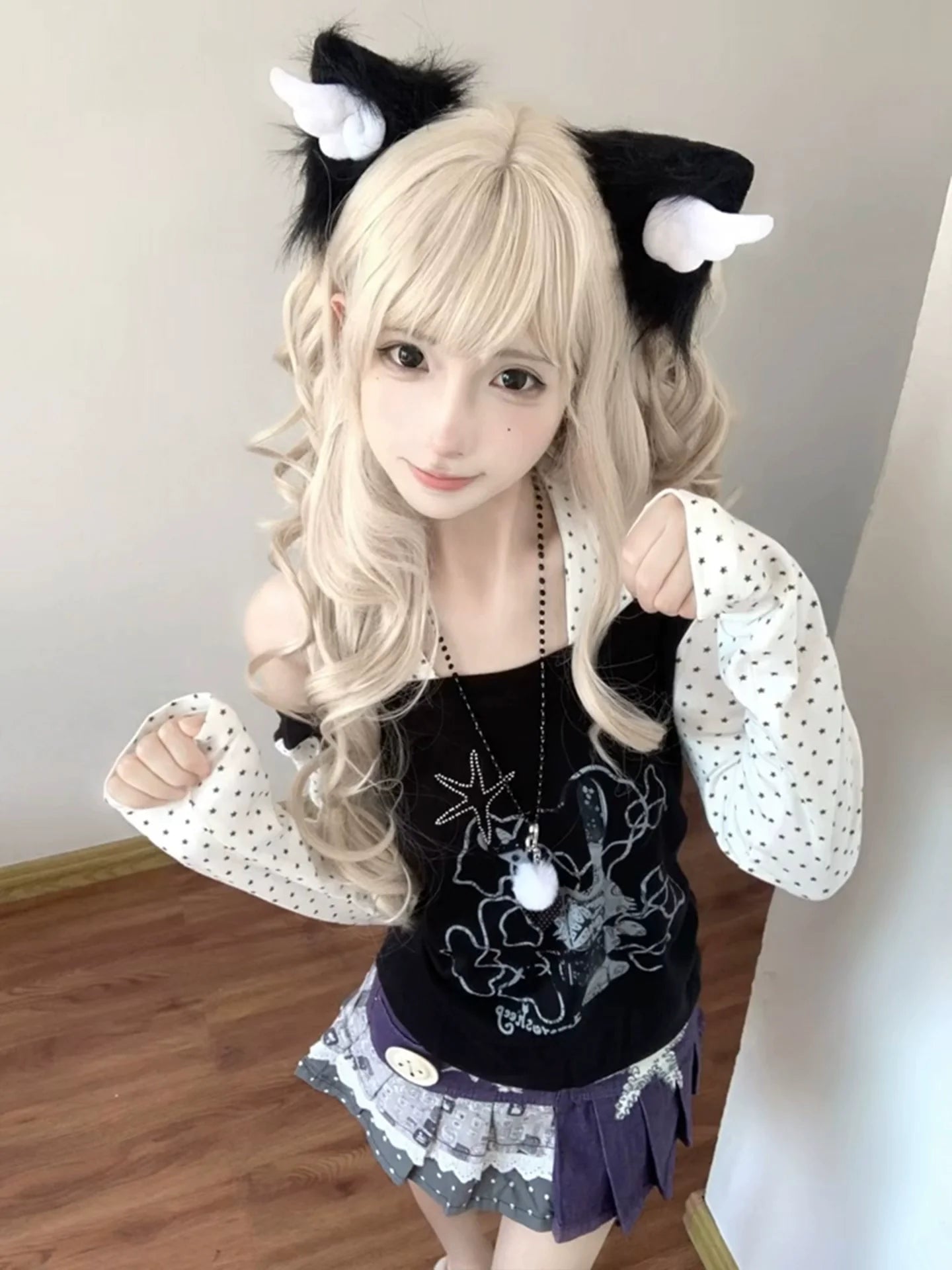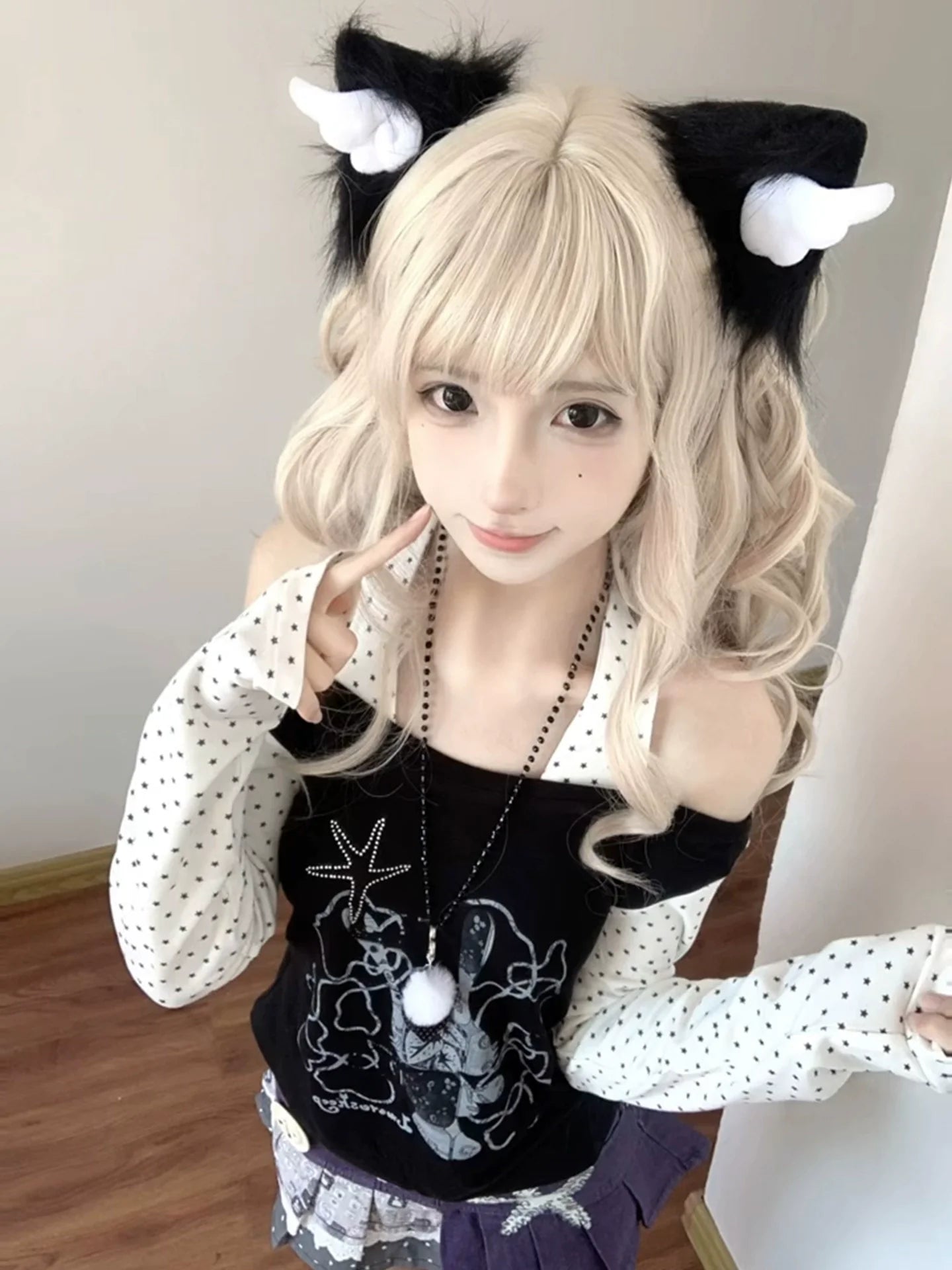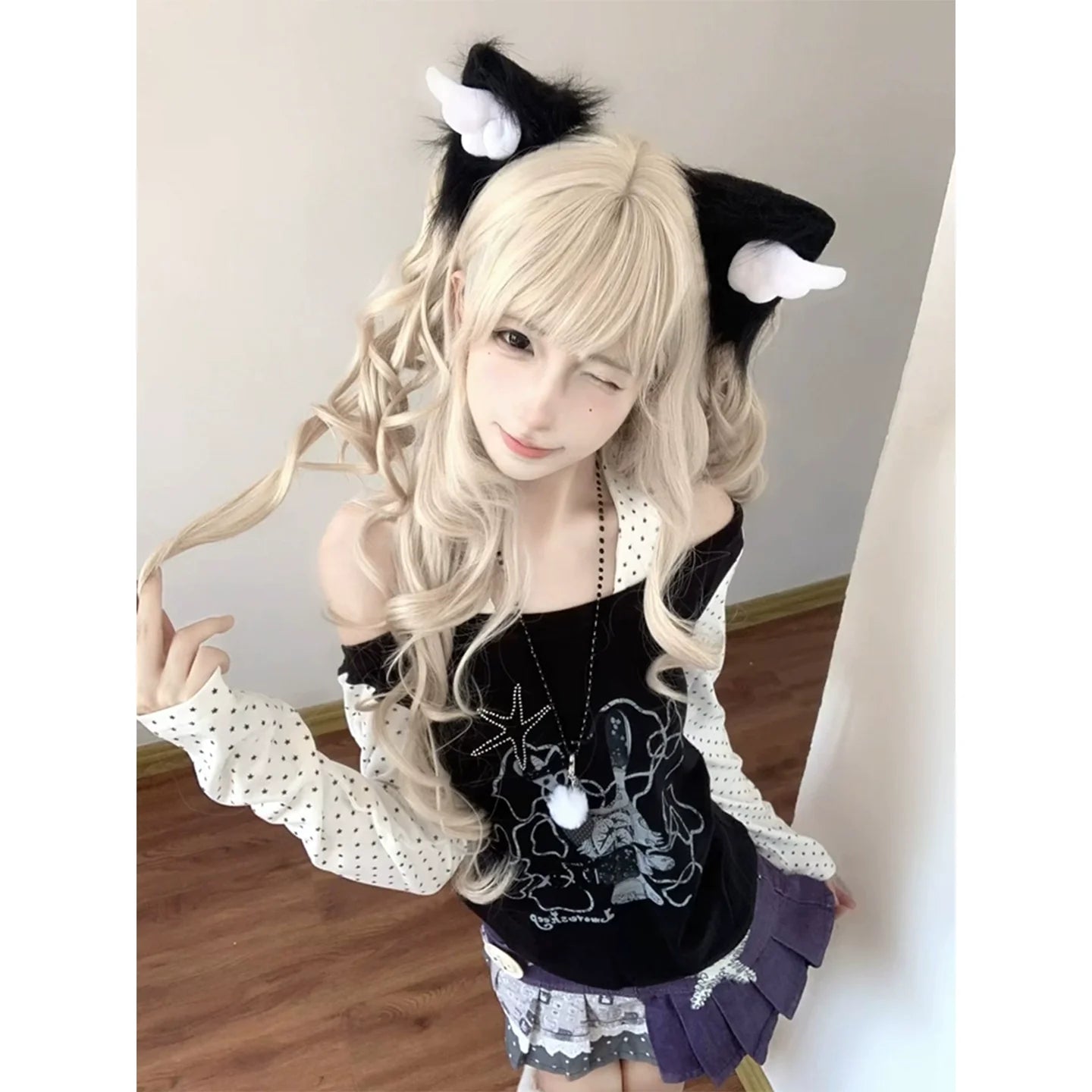 - Top: Autumn-winter layered halter long sleeve tee with black and white colorblock, large neckline, slim fit, lightweight Y2K aesthetic.
