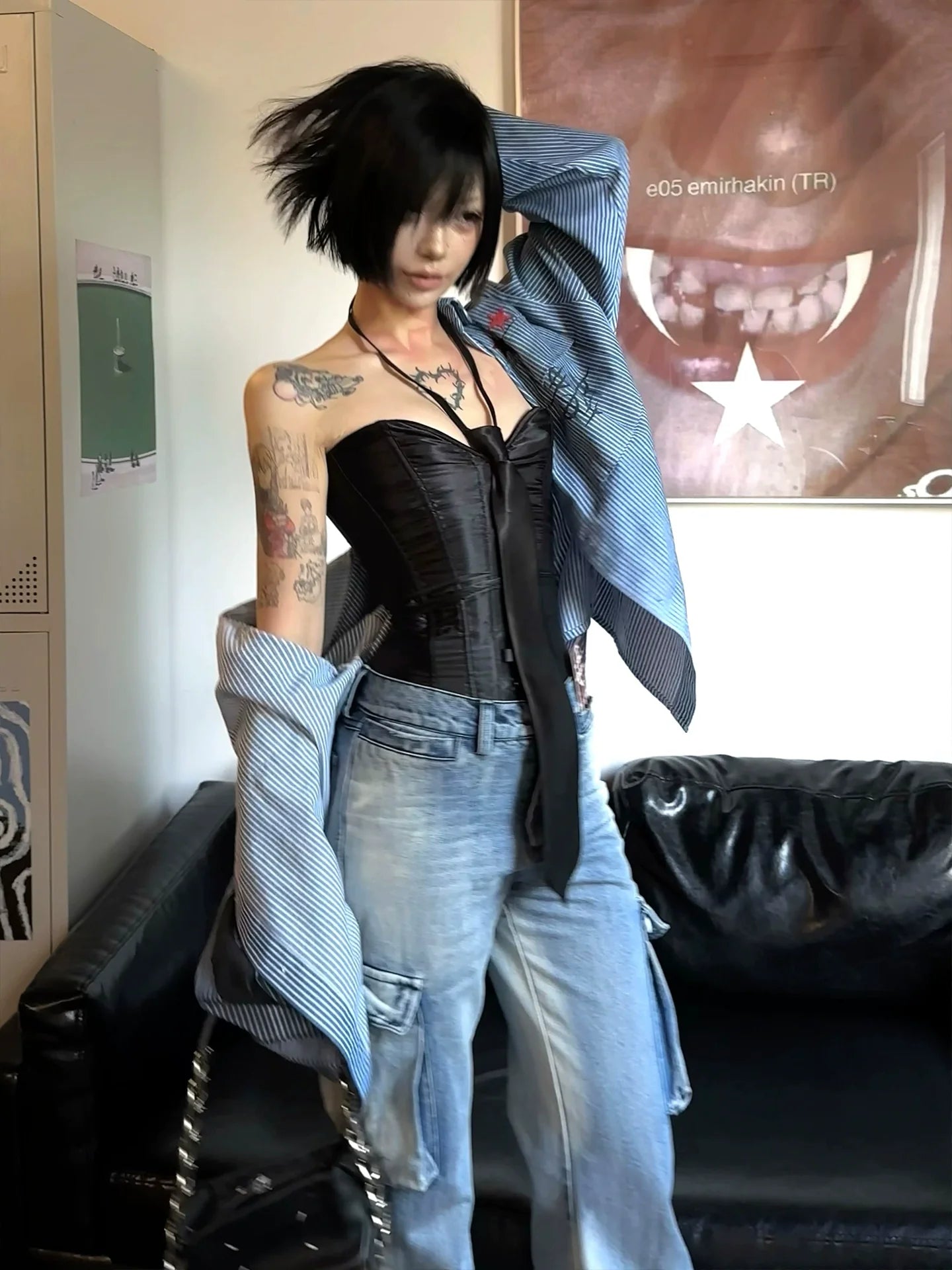 - Top: Autumn distressed striped long sleeve shirt, water-washed print, lightweight fabric, relaxed Y2K visual kei vibe.