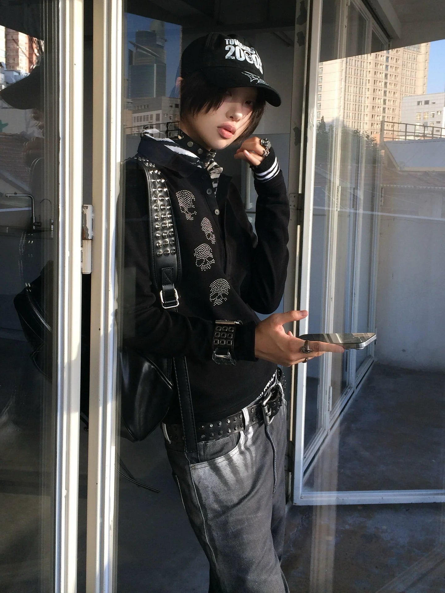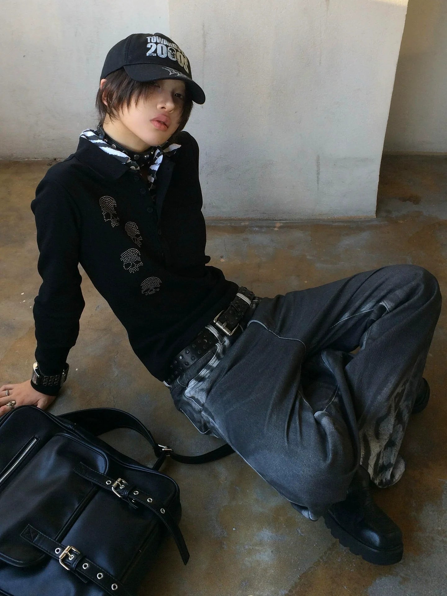 - Top: Autumn-winter long sleeve tee with fake two-layer design and polo collar, slim fit, soft cotton blend, Y2K punk and visual kei aesthetic.