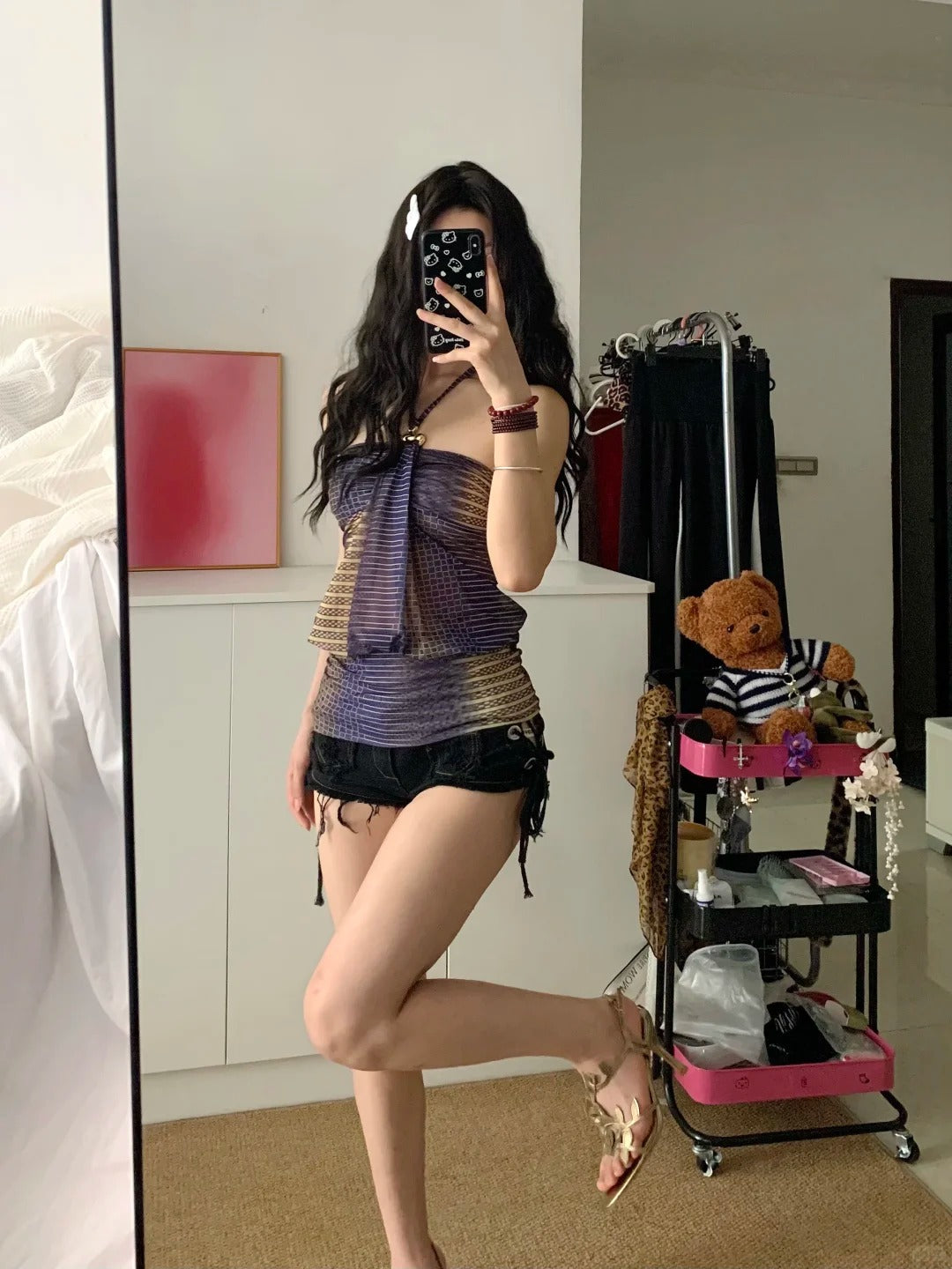 - Top: Gradient mesh halter top in shades of purple and gold, featuring a sheer, body-hugging design that adds a bold and playful Y2K edge.
