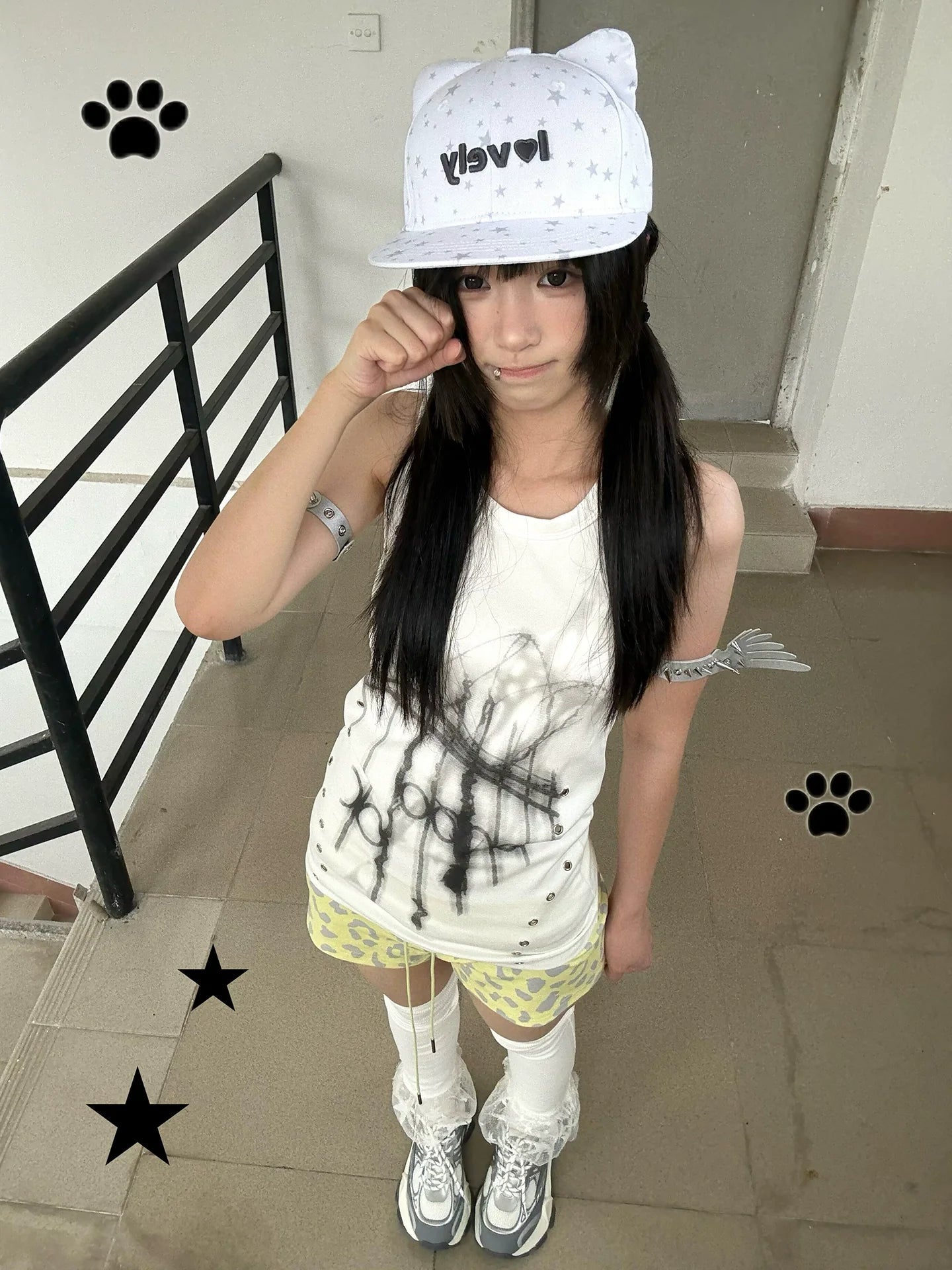 - Top: Y2K-inspired sleeveless white cami top, fitted, short cut, perfect for layering or casual summer streetwear outfits.