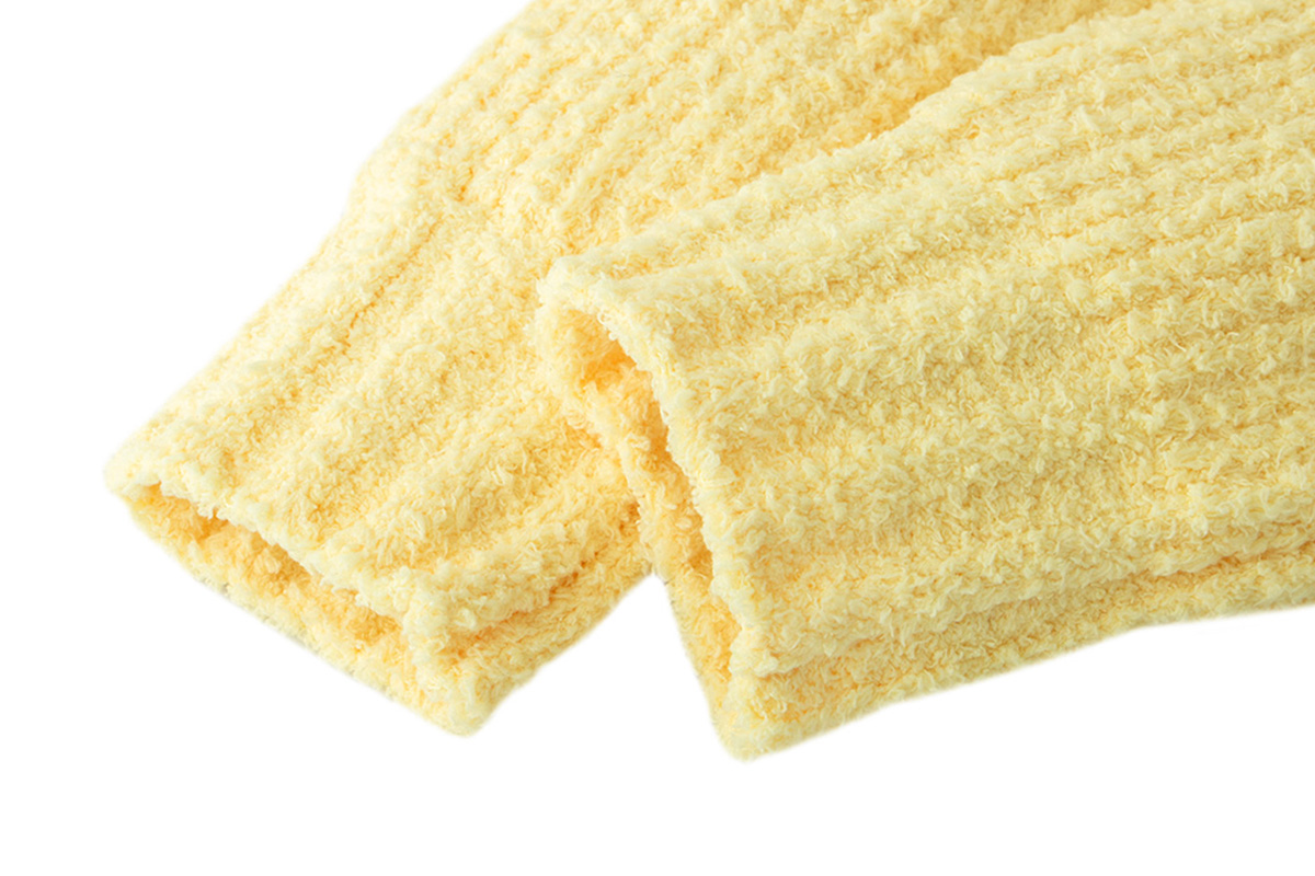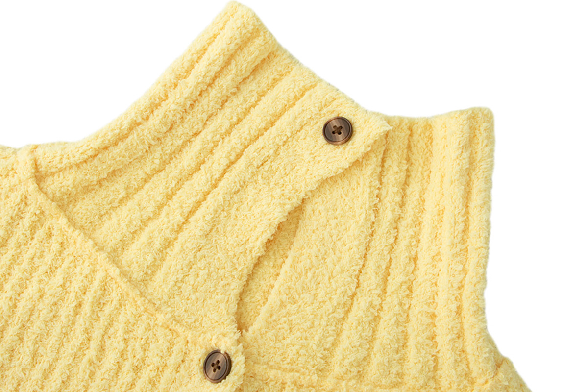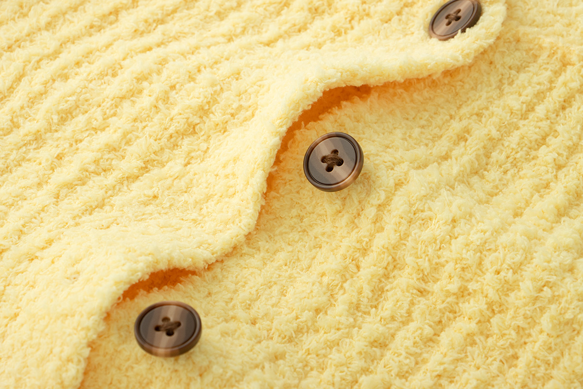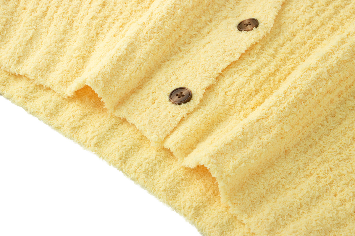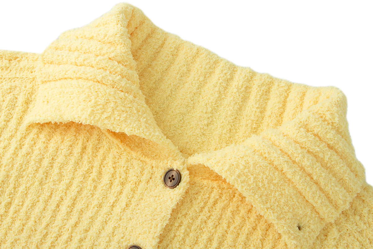 - Cardigan: Loose yellow knit cardigan with collar detail, long sleeves, and soft fabric.